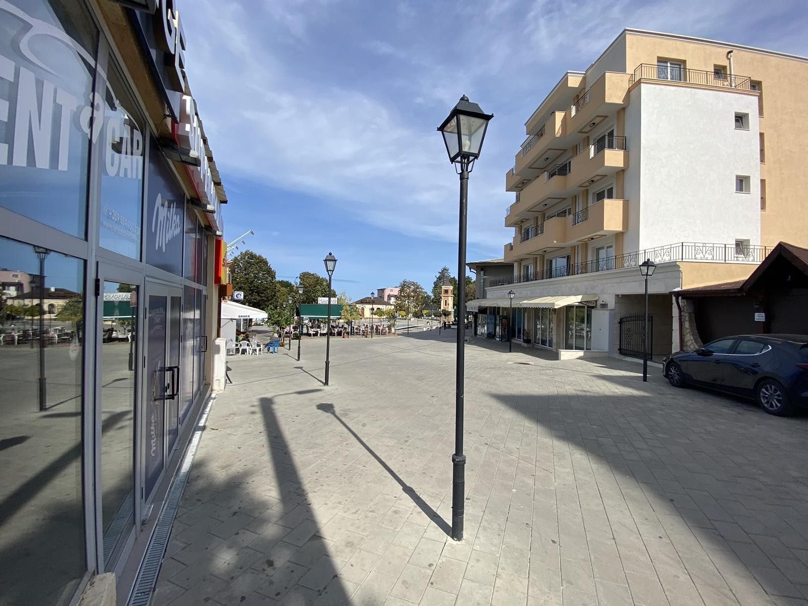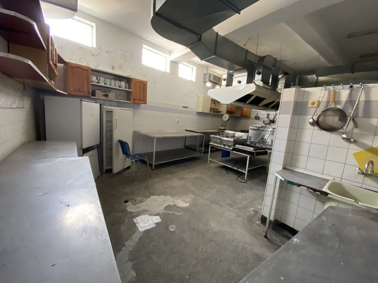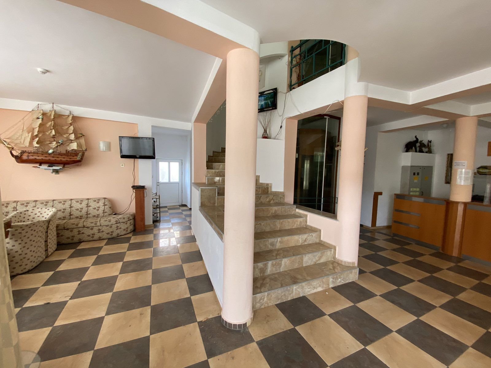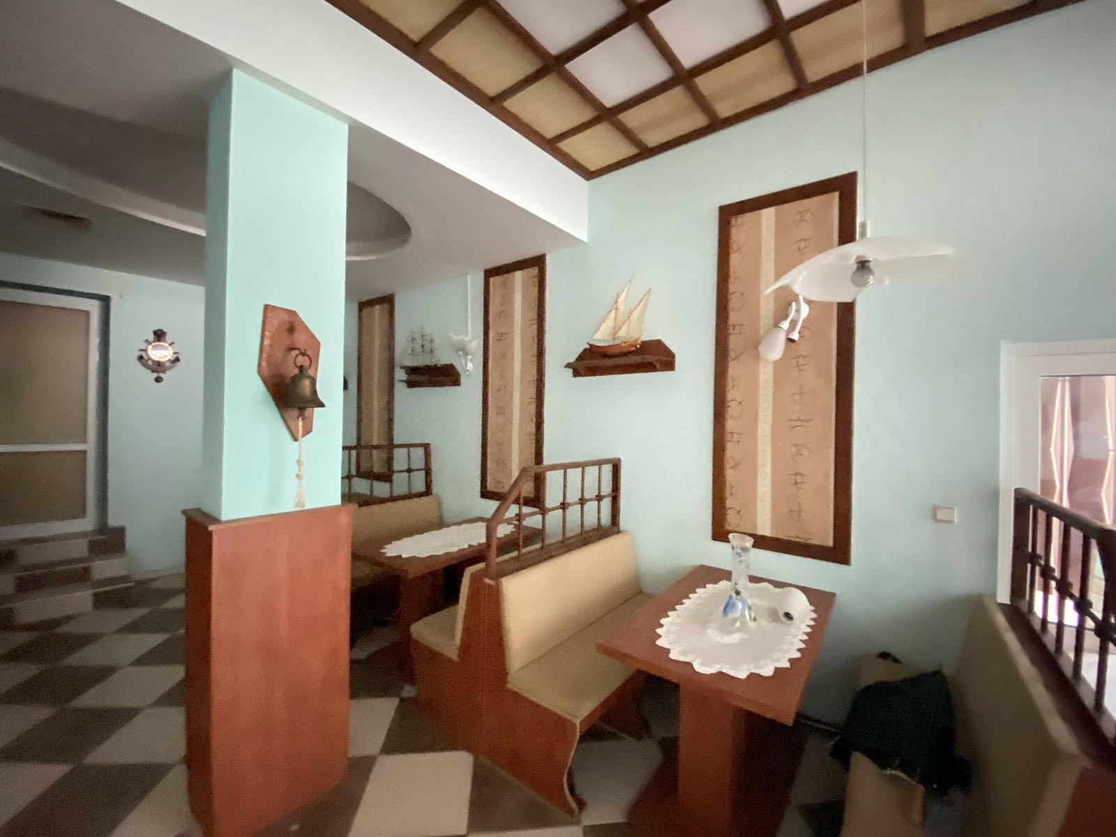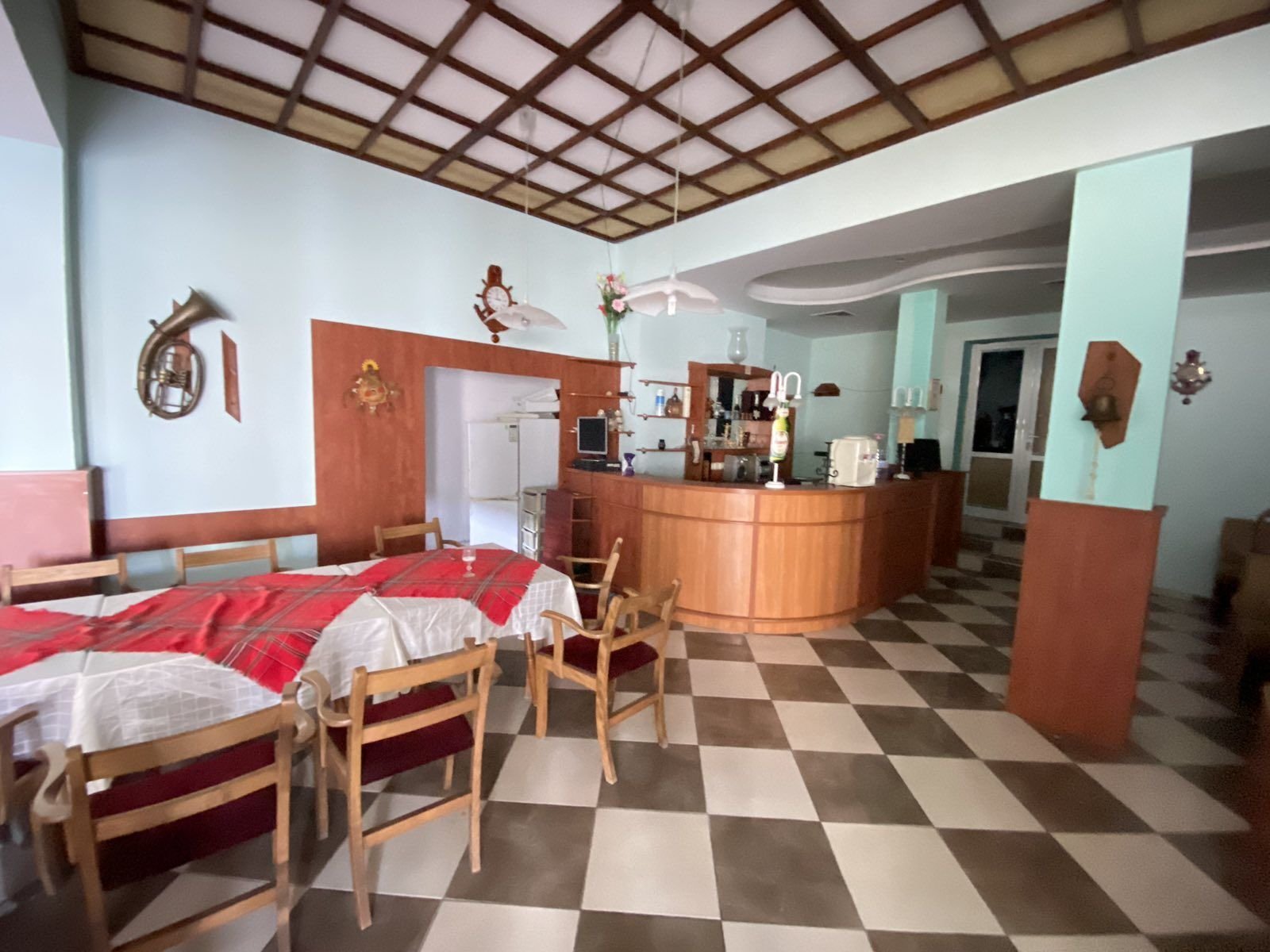 - Партерен етаж с застроена площ от 410,70 кв.м., включващ рецепция за гости, два търговски обекта за индустриални стоки, ресторант, кухня и лекарски кабинет.