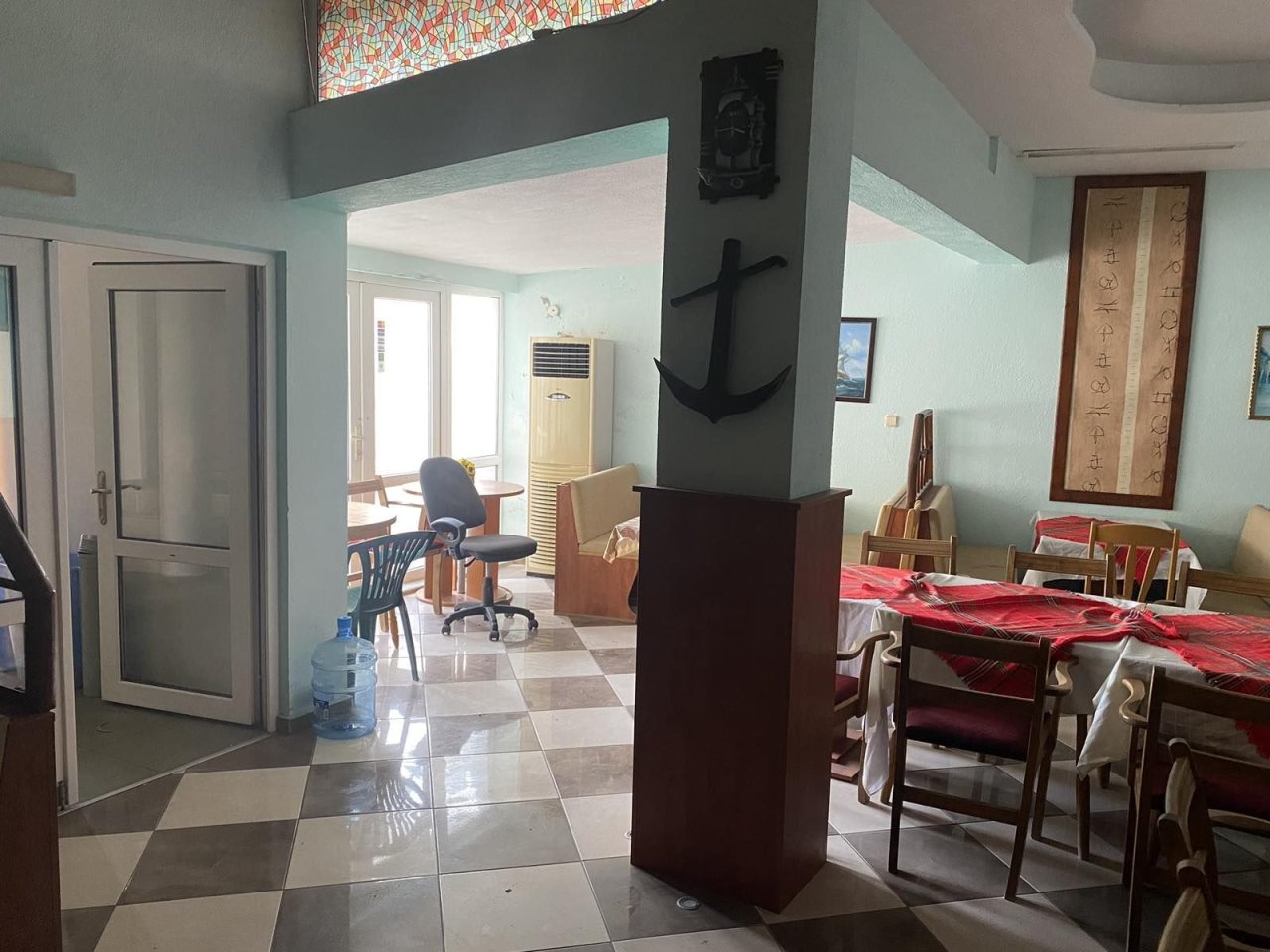 - Първи етаж с застроена площ от 433,60 кв.м., състоящ се от административна локация, четири хотелски стаи, дневна бар и конферентна зона с открита дневна бар.