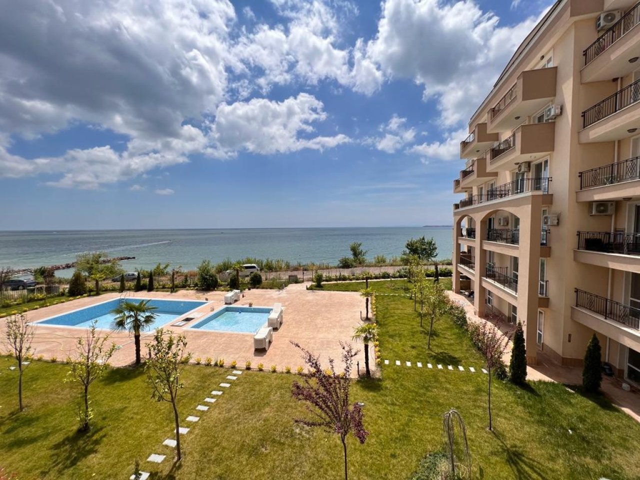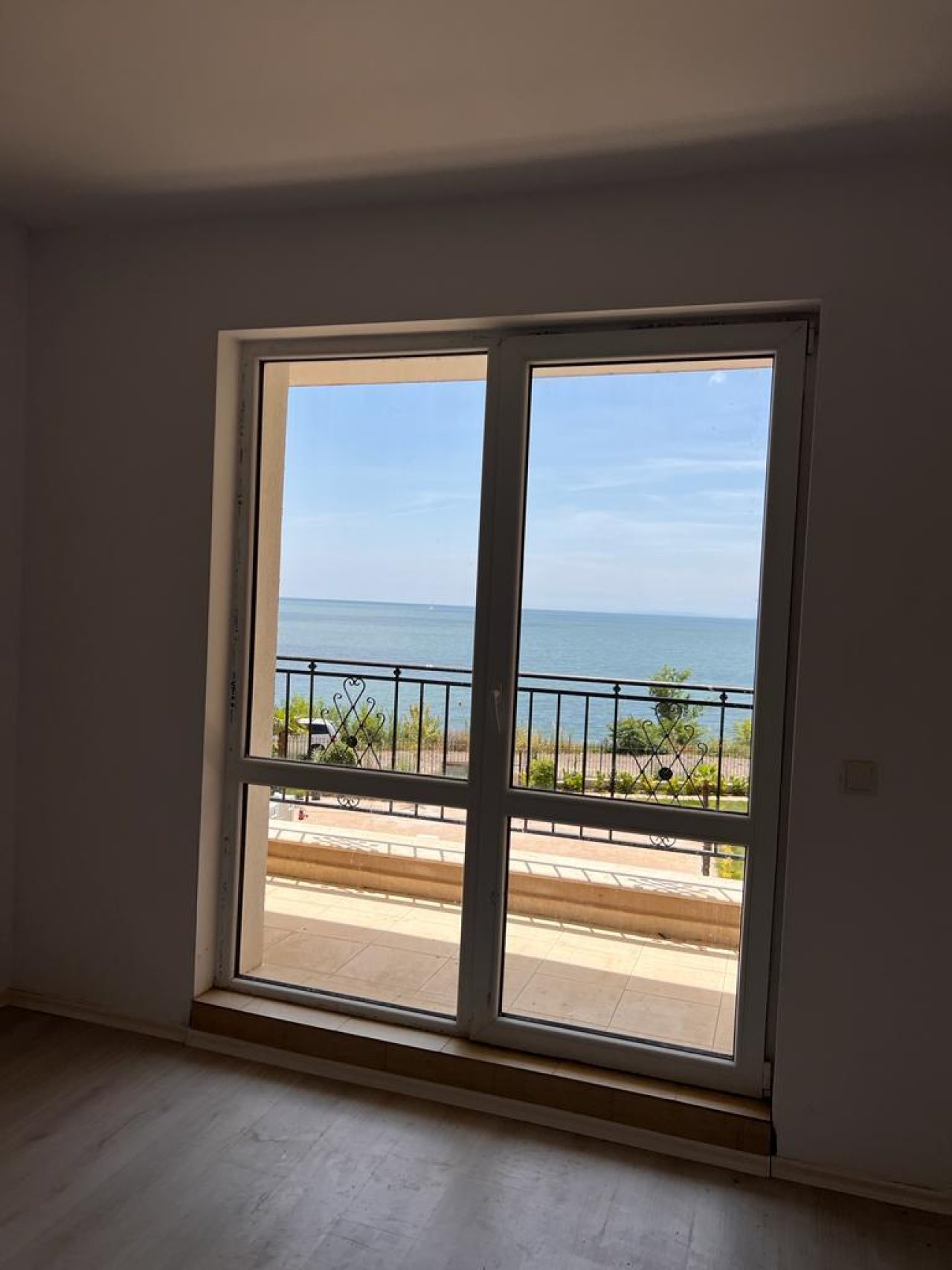 The apartment is spacious and functional, with the following layout: entrance hall, large living room, two bedrooms, bathroom with WC, separate WC, and terrace with stunning views of the sea and the pool. The apartment features doors, high-quality windows and flooring, and the bathroom and toilet are fully finished.