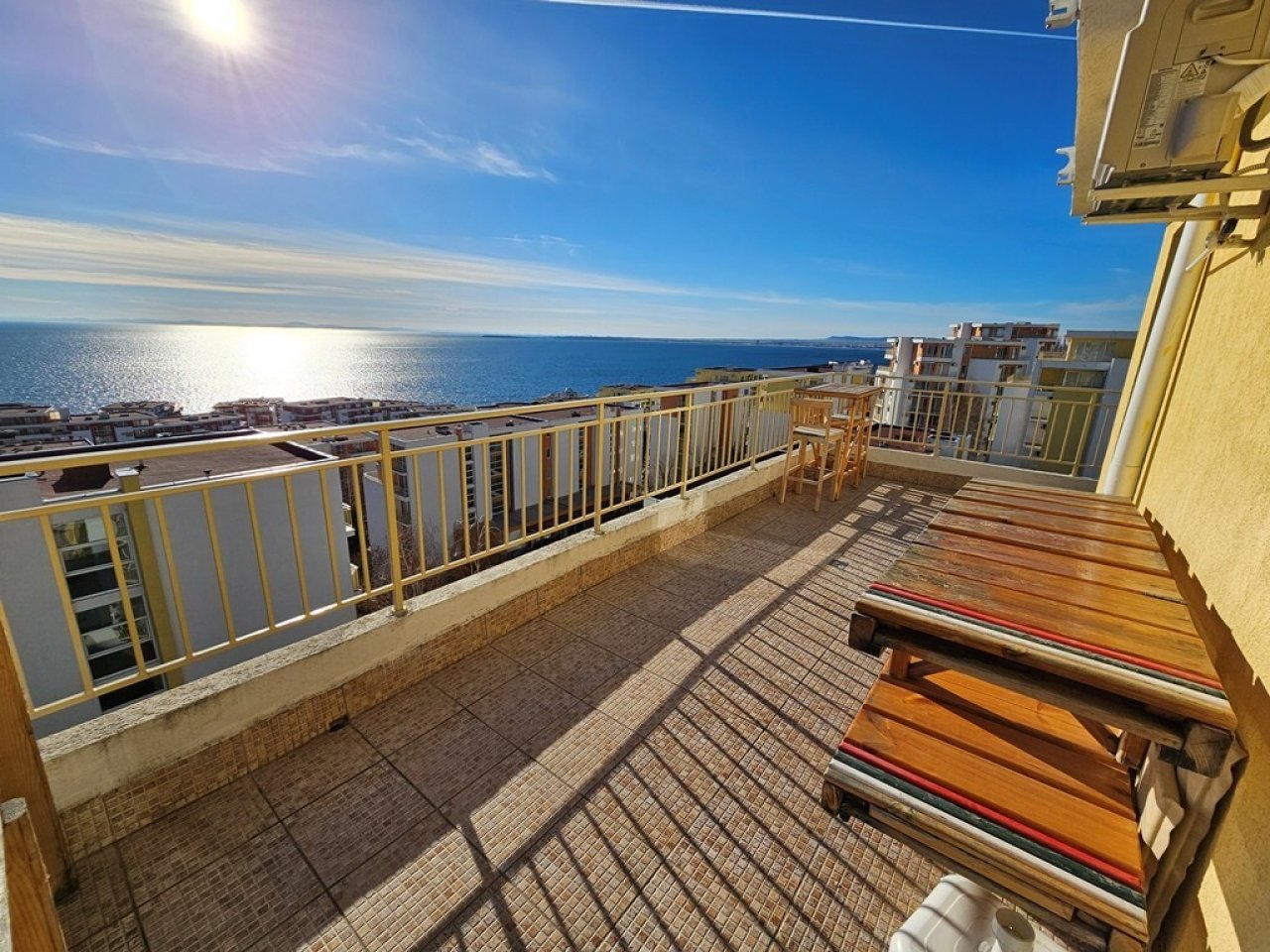 This is an exquisite, fully furnished panoramic apartment with one bedroom in Crown Fort Club, located between St. Vlas and Elenite. The apartment is on the sixth floor, has a total of 85 square meters, and features a large terrace with panoramic sea views. The apartment is bright and sunny, as it faces south. It offers magnificent sea views from all rooms and is in perfect condition, ready for immediate use.