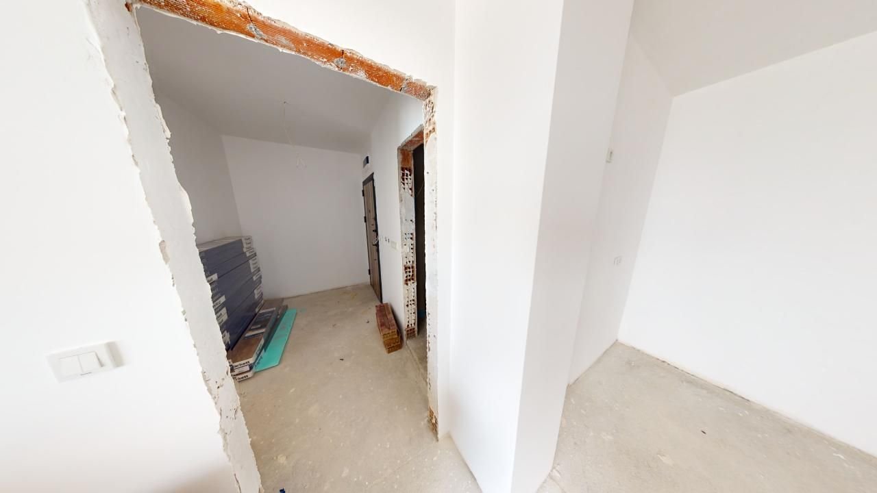 For sale is a 1-bedroom apartment in Villa Metara, which is located right by the beach. The apartment is situated on the second floor. It consists of a corridor, a living room with space for a kitchen, a bedroom, a bathroom, and two terraces—one with sea and pool views and the other with city views. There are triple-glazed windows throughout. It is a turnkey apartment, unfurnished.