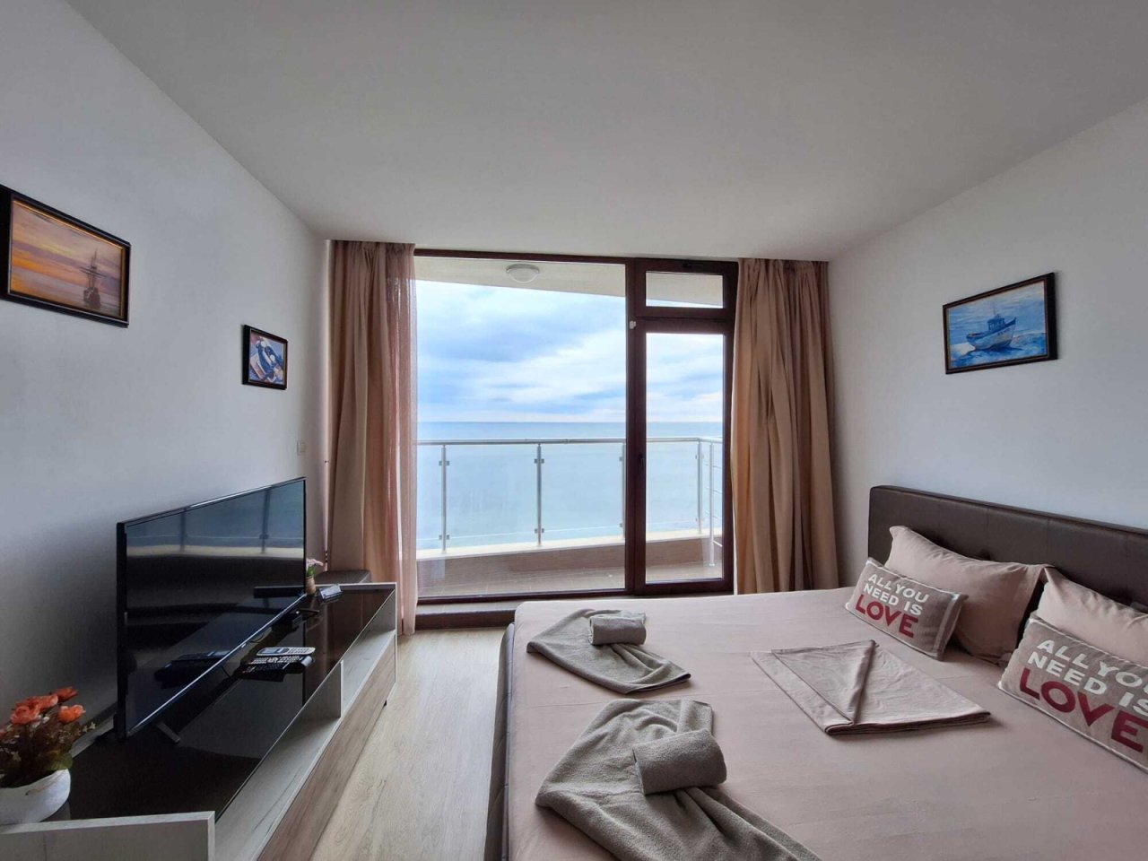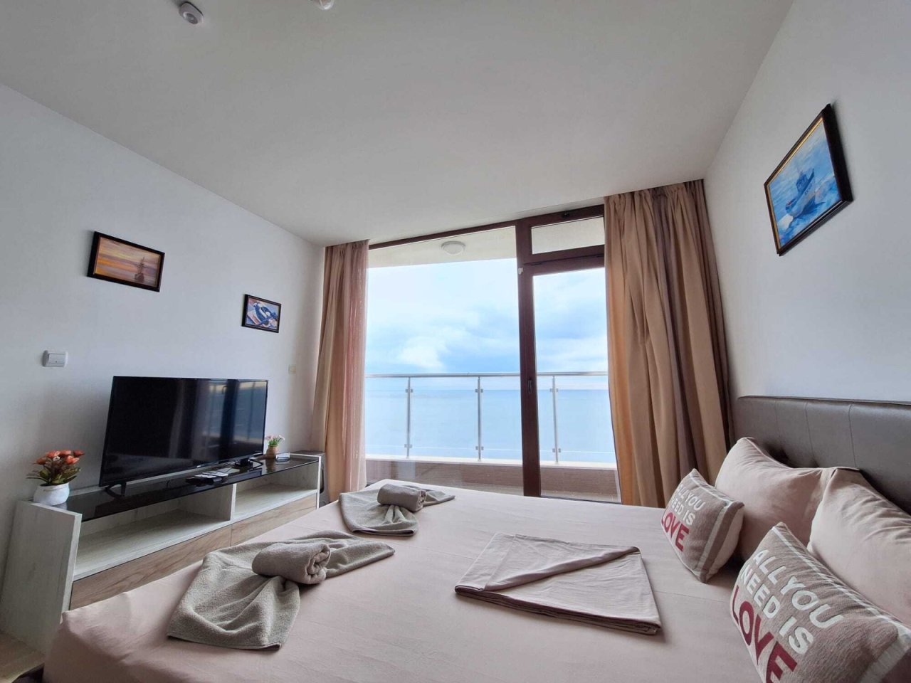 За продажба: уютен, светъл и просторен едностаен апартамент в Равда с директна гледка към морето, на първи ред, в сграда без такса поддръжка.