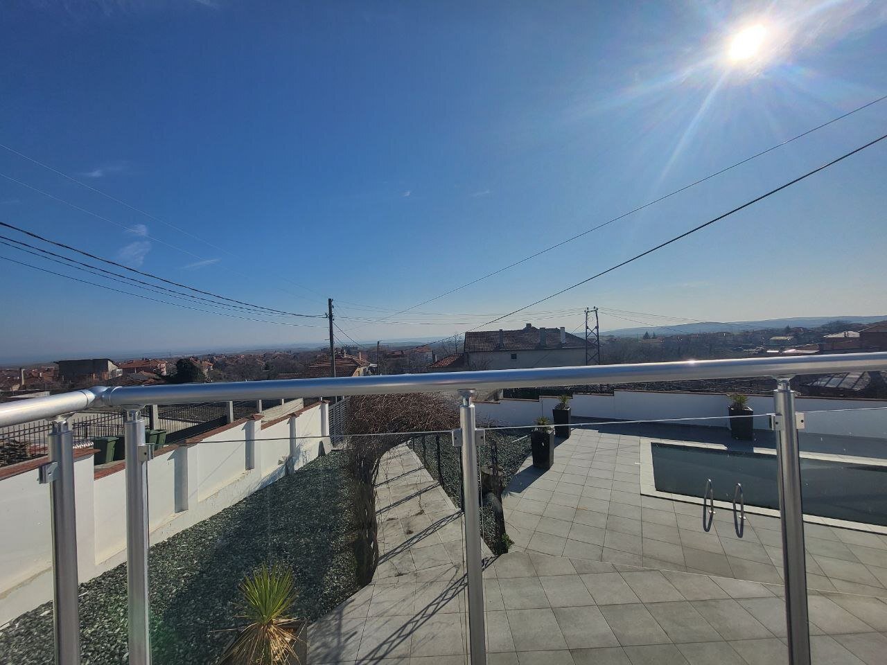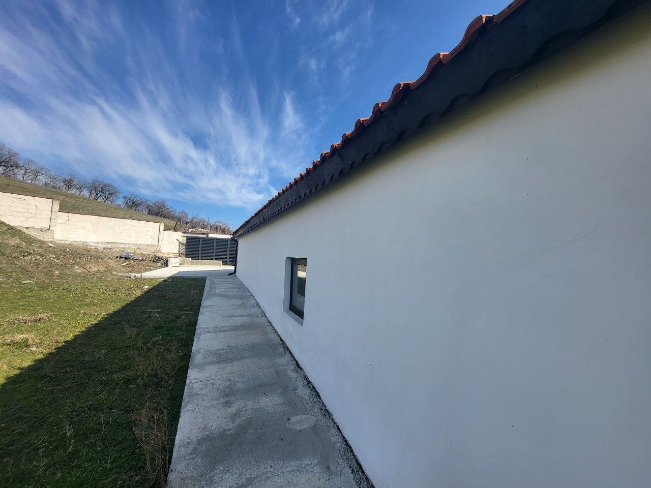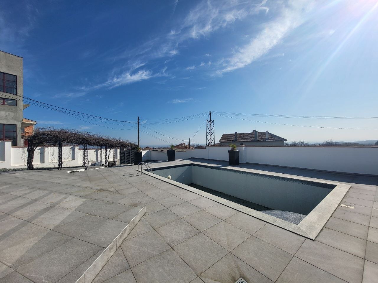 Имотът се намира на тих и спокоен улица с постоянно живеещи съседи. В близост има хранителни магазини, детска площадка, футболно игрище и др. Имотът разполага с обща застроена площ от 238 кв.м и двор от 1030 кв.м. Разпределението е следното: голяма дневна, просторна кухня с трапезария, 4 спални, 3 бани, офис, голяма тераса, отоплително помещение, две тавански стаи, двор с басейн и отделна пристройка за материали, инструменти и други неща за поддръжката на басейна и зелени площи.