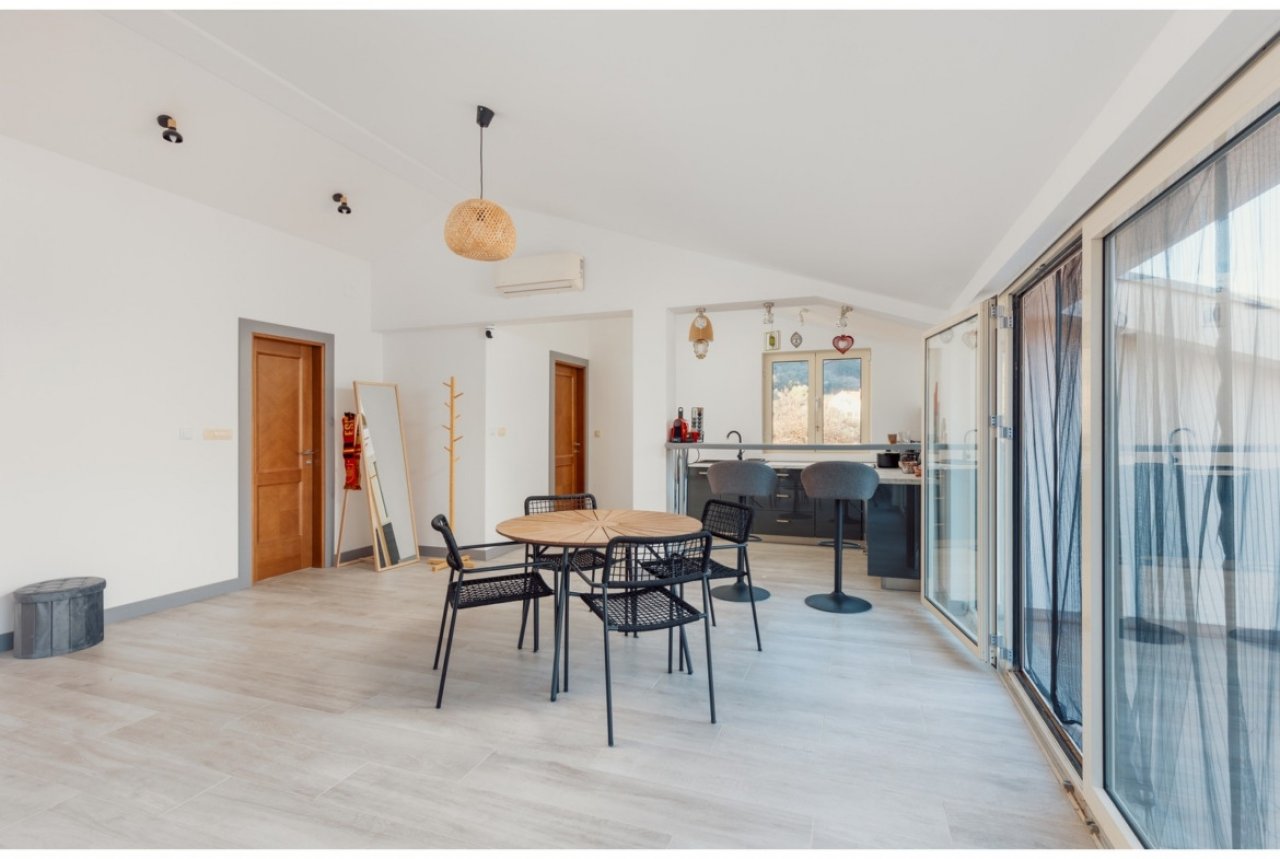 Апартаментът е с обща площ от 154 м² и се намира на трети етаж в нискоетажна сграда, която включва само седем жилищни единици. Благодарение на местоположението си на последния етаж, той предлага непрекъсната гледка към Адриатическо море, крайбрежието и околните природни пейзажи. Сградата е построена на склон и въпреки че пътя за достъп е по-стръмен, резултатът под формата на гледка, уединение и тишина определено си заслужава. Само на няколко минути пеша е до морето.
