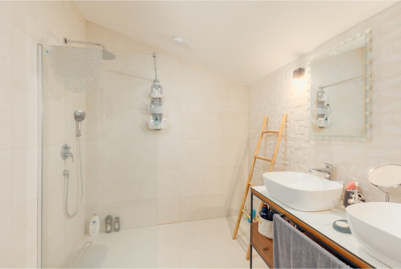 Апартаментът разполага с две удобни спални и две бани. Една от баните има връзка за домашно спа/уелнес оборудване, което позволява още по-високо ниво на комфорт. Налично е и голямо отделно място за съхранение, подходящо например като перално помещение, мокро помещение или склад за сезонни артикули. Интериорът е частично обзаведен със светли мебели, а кухнята е напълно оборудвана, което позволява незабавно ползване на апартамента или лесното му преоборудване според собствените предпочитания.