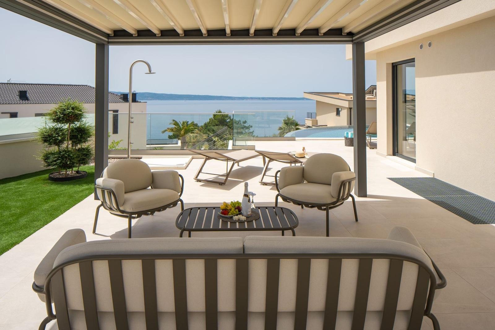 Вилата включва биоклиматична пергола, която осигурява сянка и защита от атмосферните условия, и външна кухня с газов грил, идеална за средиземноморски начин на живот. Къщата е проектирана да бъде удобна както за целогодишно живеене, така и за интензивно сезонно ползване.