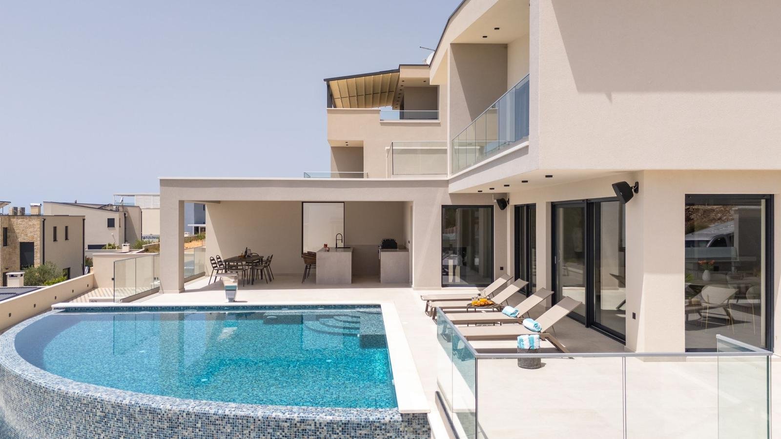 Тази изключителна вила предлага надстандартно пространство, уединение и атмосфера, съчетавайки луксозен живот с интелигентна инвестиция в едно от най-желаните места на хърватското крайбрежие. Имотът е разположен върху просторен парцел от 618 м² и осигурява нетна жилищна площ от 292,90 м², разпределена на три етажа. Общата брутна жилищна площ е 384 м², което създава достатъчно място както за комфортно семейно живеене, така и за първокласно туристическо отдаване под наем.