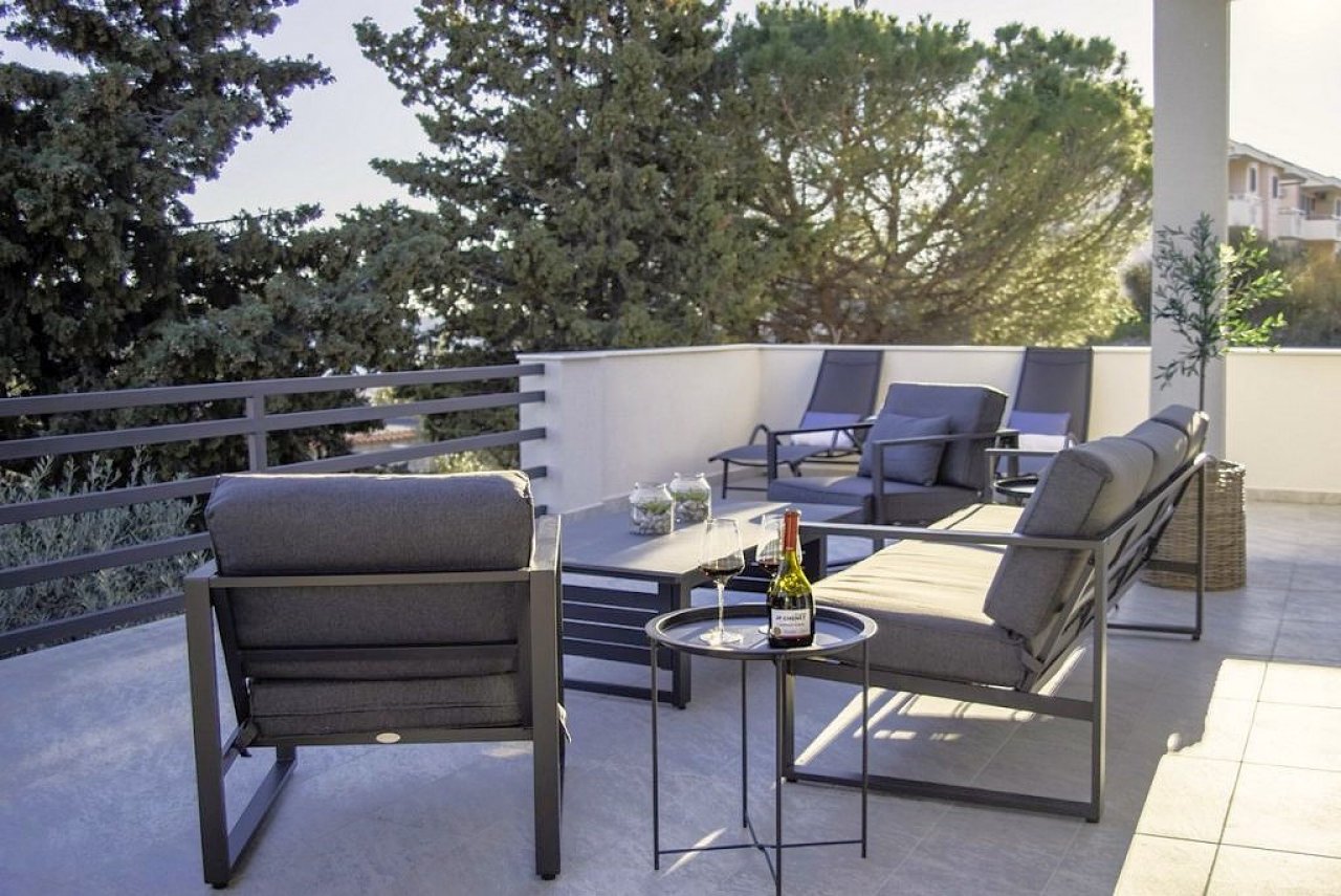 От дневната има директен достъп до изключително голяма тераса с изглед към залива на Рогозница. Терасата е разделена на покрита площ от 12 м² и открита площ от 36 м², което позволява гъвкаво използване през целия ден. Общата използваема площ на апартамента достига 74 м² и създава идеално пространство за релакс, хранене и вечерно сядане с гледка към морето.
