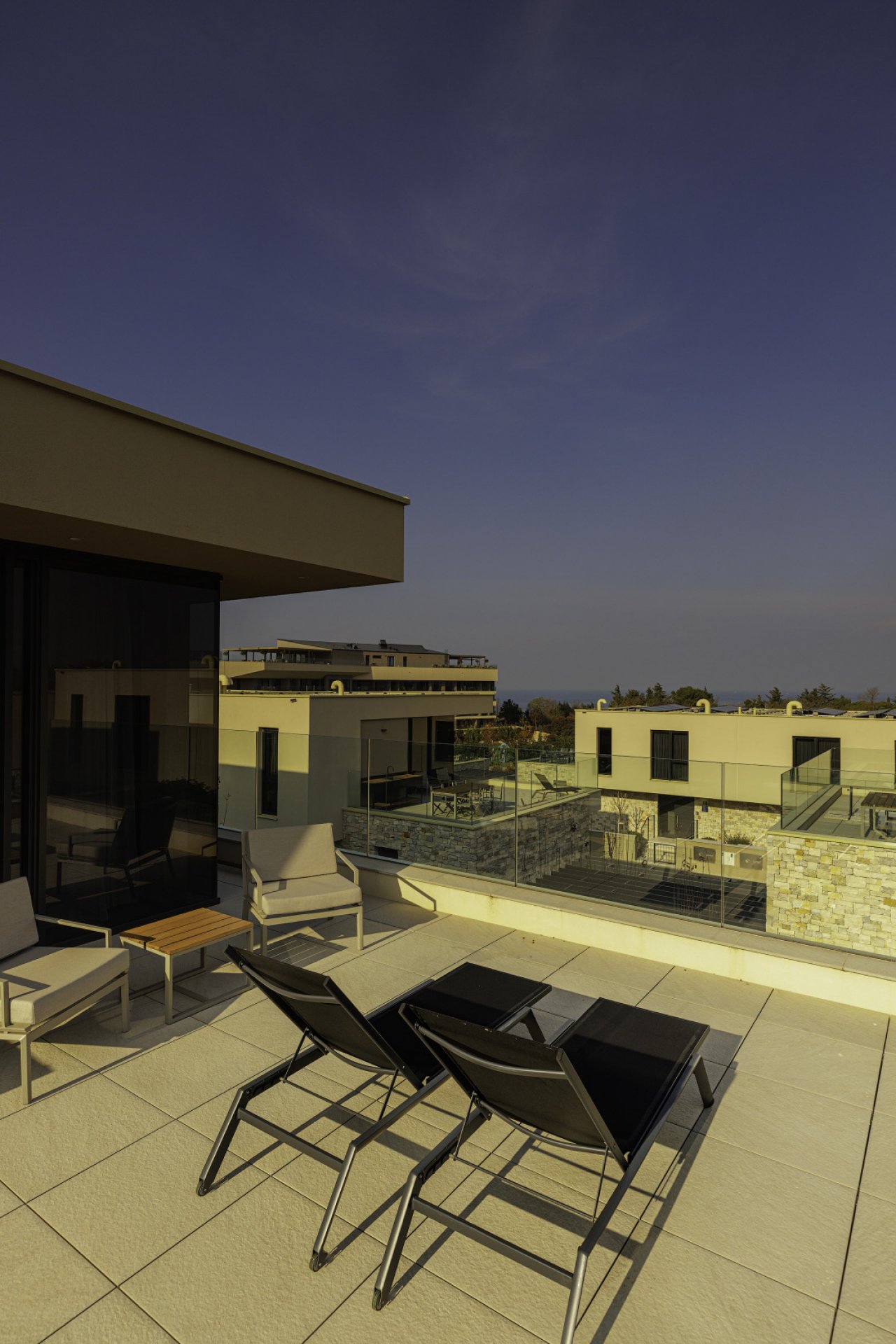 Интериорът е обзаведен с модерни висококачествени мебели, акцентът е върху комфорта, уединението и връзката с околната природа.