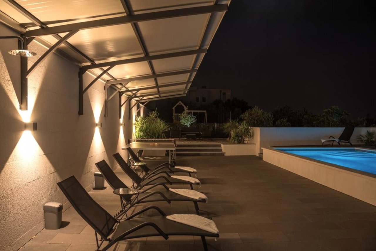 Къщата е разделена на два етажа. Приземният етаж предлага приятна гледка към зелените маслинови горички, докато първият етаж предлага невероятна гледка към морето и островите Брач, Хвар и Корчула. Всяка част от къщата носи различна атмосфера, независимо дали търсите спокойствие или вдъхновение. Целият имот е заобиколен от внимателно поддържана градина, която осигурява не само уединение, но и пространство за живот на открито. Доминиращата характеристика е отопляем басейн със солена вода без използване на хлор, допълнен с детска площадка, модерна външна кухня с грил и покрита зона за сядане за дълги летни вечери. Има и просторен двор и паркинг за 2 до 3 коли.