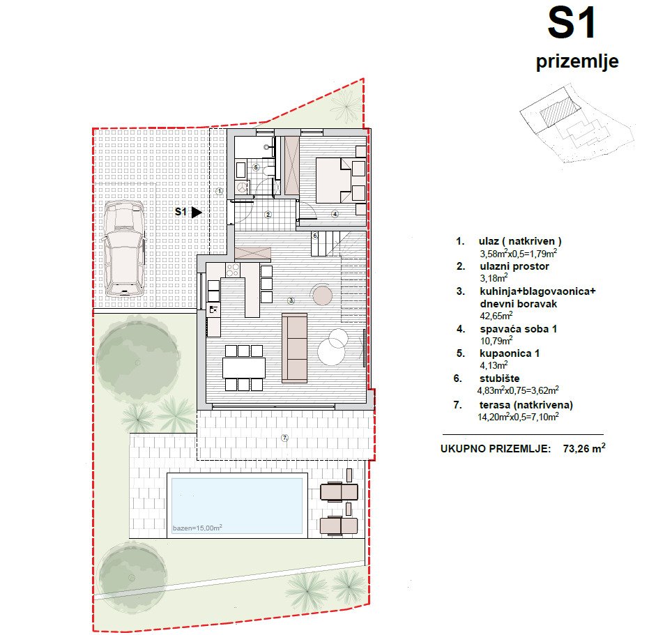 Вила S1 е с обща нетна използваема площ от 168,08 м² и включва жилищна площ от 137,06 м², плувен басейн от 15 м², вътрешен двор от 79,32 м² и паркинг от 32,35 м². Разпределението е проектирано на два етажа. Приземният етаж предлага входно антре, спалня, баня и отворена дневна зона с кухня и трапезария с достъп до покрита тераса и отопляем басейн. На горния етаж има главна спалня със собствена баня, дрешник и покрита тераса, още една спалня и баня. Цената е 675 000 евро.