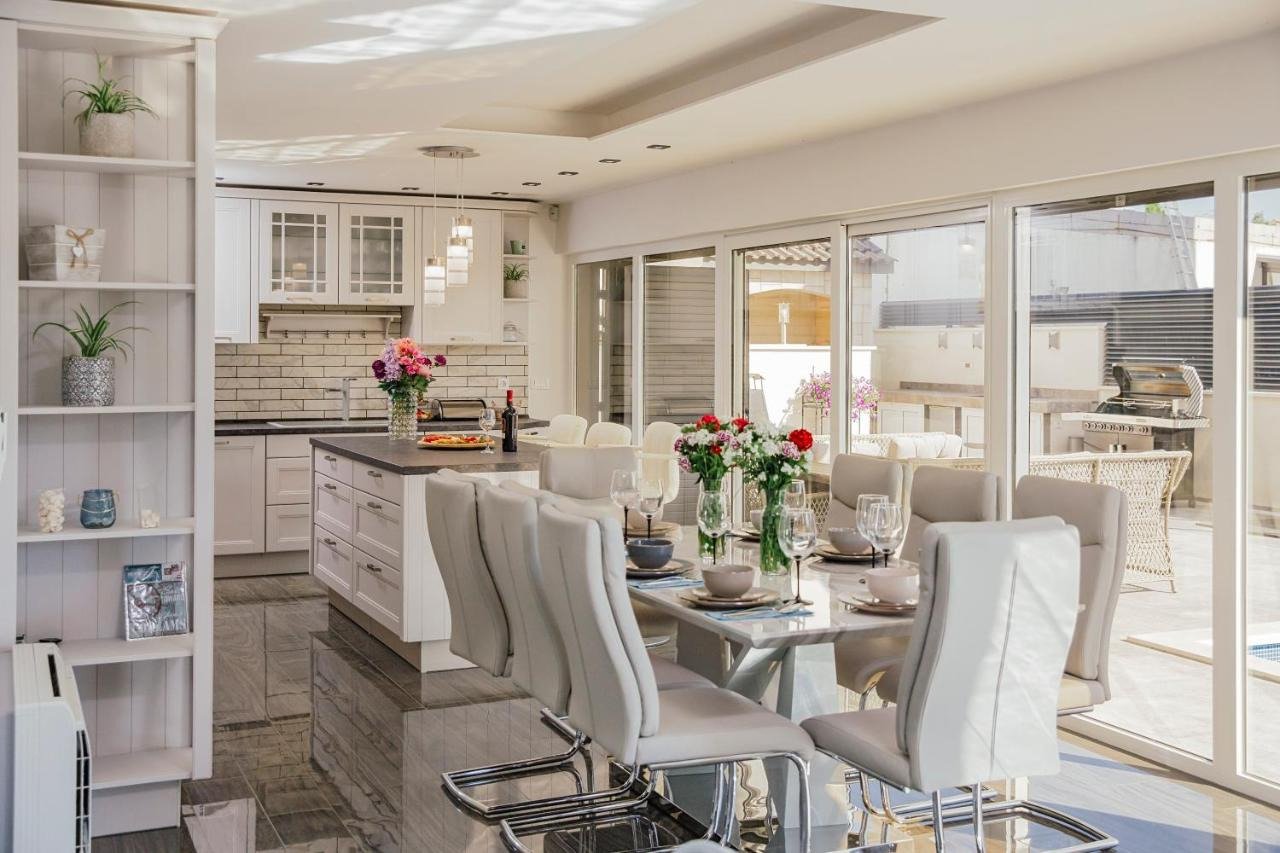Das Erdgeschoss des Hauses ist als luftiger Wohnbereich mit angrenzendem Wohnzimmer und voll ausgestatteter Küche gestaltet, in dem alles fließend und ohne Barrieren ineinander übergeht. Der direkte Zugang zur Terrasse und zum Garten schafft eine ideale Verbindung zwischen Innen und Außen. Ein privater Pool, Sonnenliegen, ein Essbereich im Freien und ein Grillplatz laden zu langen Sommerabenden und unvergesslichen Momenten ein. Der Garten ist liebevoll mit mediterranem Grün angelegt und unterstreicht den Charakter des gesamten Anwesens.…