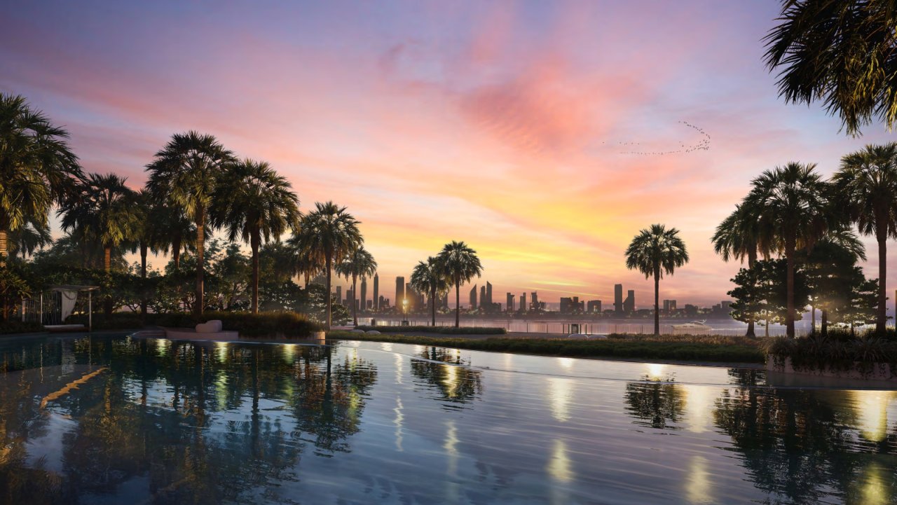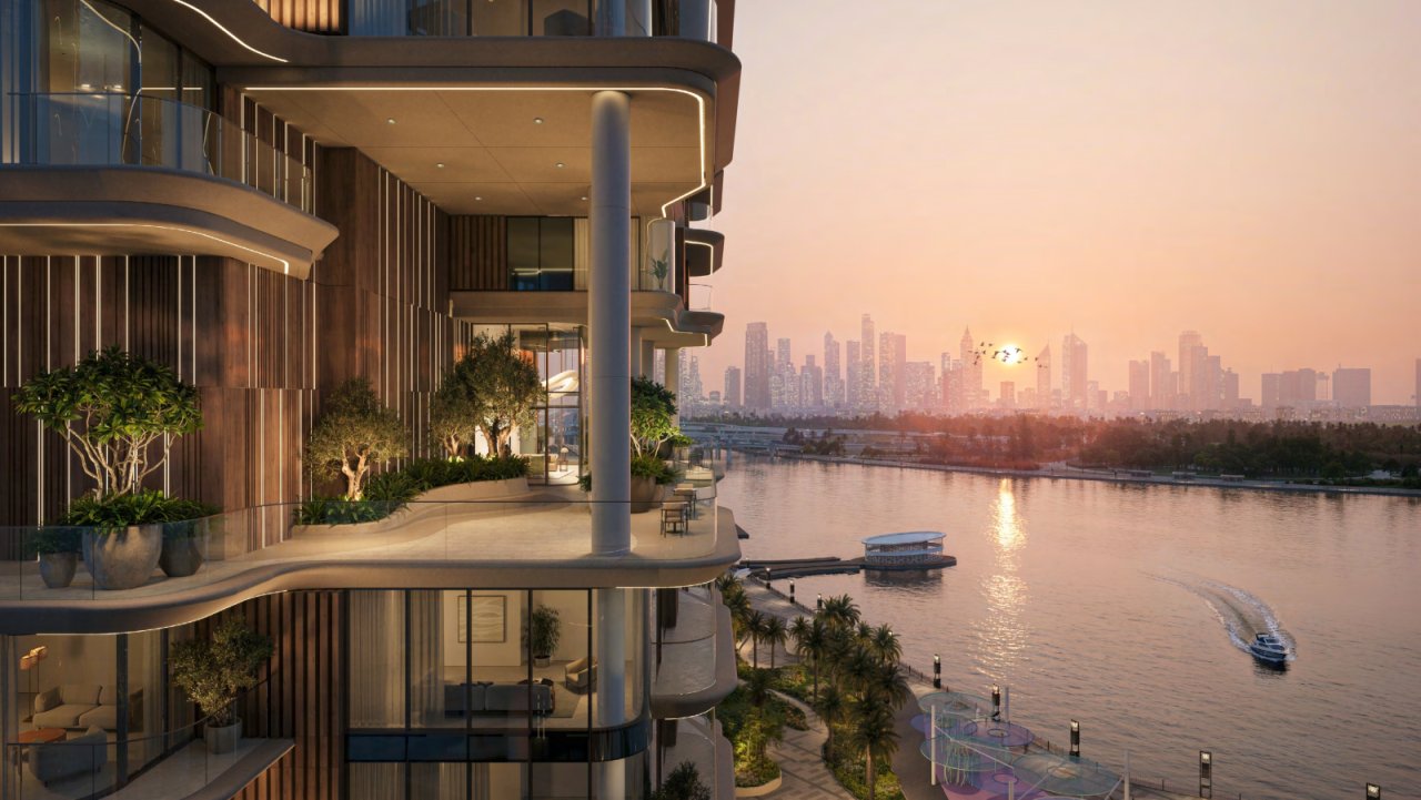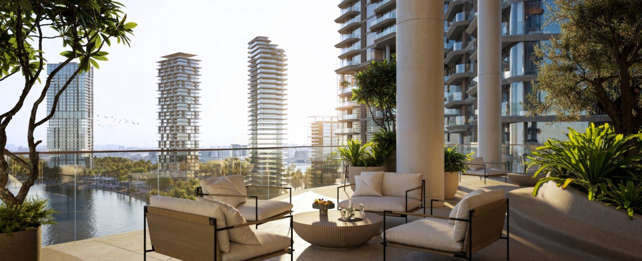 „Entlang der Uferlinie von Dubai Design erhebt sich eine Vision am Wasser in drei skulpturalen Bewegungen – ein Ensemble, das Stadt und Wasser miteinander verbindet. Stadt Gartens schaffen lebendige Rückzugsorte und bringen Licht, Grün und frische Luft in das Herz der Türme.“