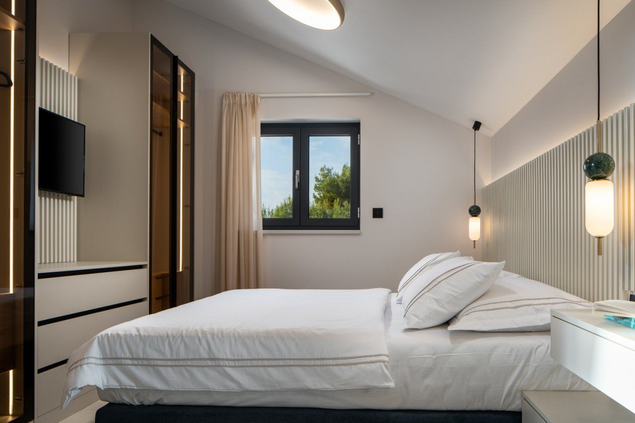 Im ersten Stock befinden sich drei separate Schlafzimmer, jeweils mit eigenem Bad und Loggia, die maximale Privatsphäre für alle Bewohner und Gäste gewährleisten. Die Terrasse bietet einen wunderschönen Meerblick, der den außergewöhnlichen Charakter des gesamten Anwesens unterstreicht und seinen Wert langfristig steigert.