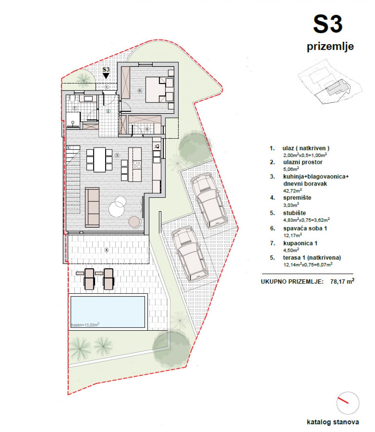 Villa S1 verfügt über eine Gesamtnutzfläche von 168,08 m² und umfasst eine Wohnfläche von 137,06 m², einen 15 m² großen Swimmingpool, einen 79,32 m² großen Innenhof und einen 32,35 m² großen Parkplatz. Die Villa erstreckt sich über zwei Etagen. Im Erdgeschoss befinden sich der Eingangsbereich, ein Schlafzimmer, ein Badezimmer und ein offener Wohnbereich mit Küche und Esszimmer sowie Zugang zu einer überdachten Terrasse und einem beheizten Pool. Im Obergeschoss befinden sich ein Hauptschlafzimmer mit Bad en suite, Ankleidezimmer und überdachter Terrasse sowie ein weiteres Schlafzimmer und ein Badezimmer. Der Preis beträgt 675.000 Euro.
