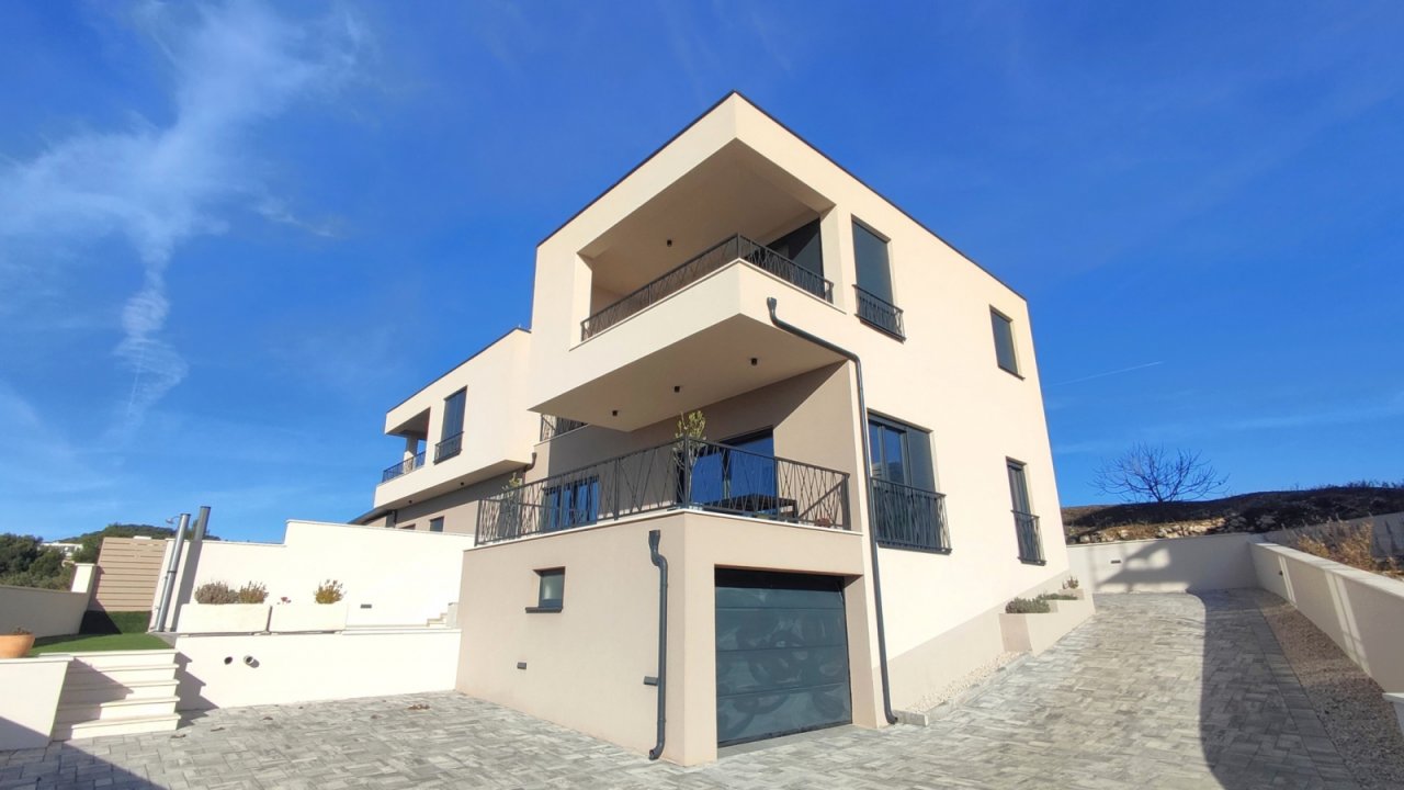 In einer attraktiven Lage in Vodice, auf einer leichten Anhöhe in einer ruhigen Sackgasse, befindet sich ein neu erbautes, luxuriös möbliertes Doppelhaus mit Panoramablick auf das Meer und die Stadt.