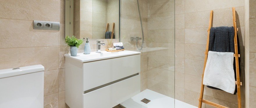 Zur Ausstattung gehören Einbauschränke, Klimaanlage, eine voll ausgestattete Küche mit Geräten, LED-Beleuchtung und luxuriöse Badezimmer mit Badmöbeln, Spiegel und Dusche.