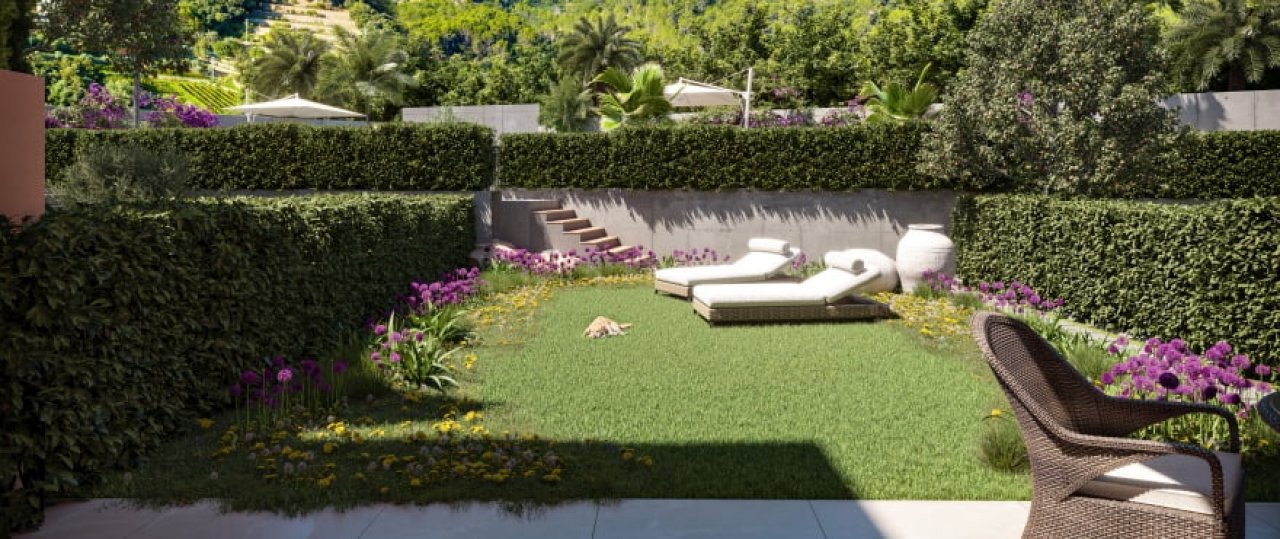 Das Haus verfügt über einen 11 m² großen Privatgarten und eine 33 m² große Terrasse, die absolute Privatsphäre und direkten Zugang zu den gepflegten Gemeinschaftsgärten und dem Swimmingpool bieten. Zum Haus gehört ein eigener Parkplatz mit der Möglichkeit zur Installation einer Ladestation für Elektroautos. Die Südwestausrichtung sorgt den ganzen Tag über für viel Tageslicht.