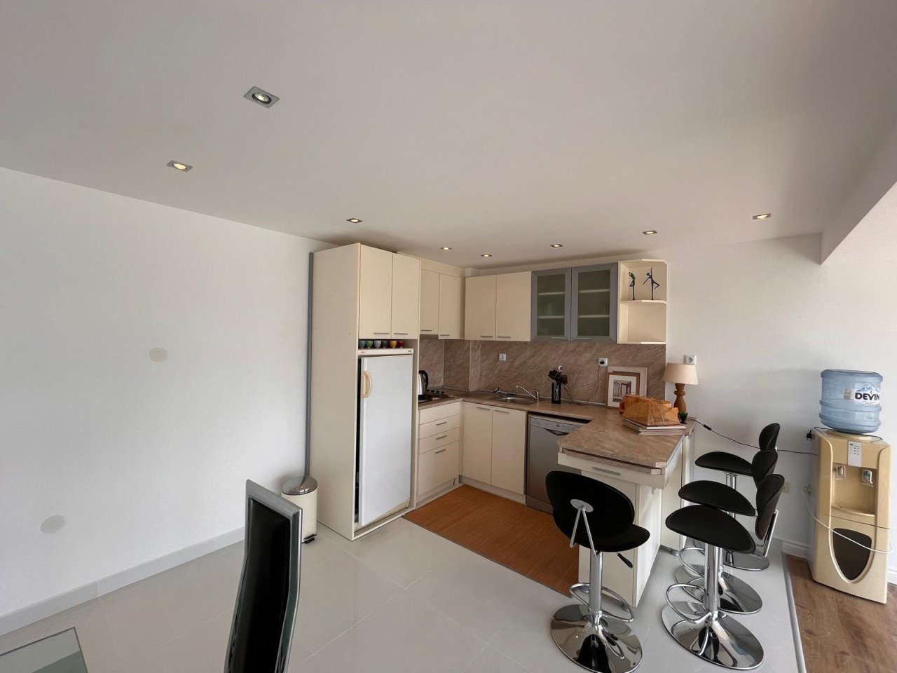 Die Immobilie besteht aus einem großzügigen Wohnzimmer mit offener Küche, drei Schlafzimmern, zwei Badezimmern sowie zwei Terrassen. Große Panoramafenster sorgen für viel Tageslicht und bieten einen teilweisen Meerblick.