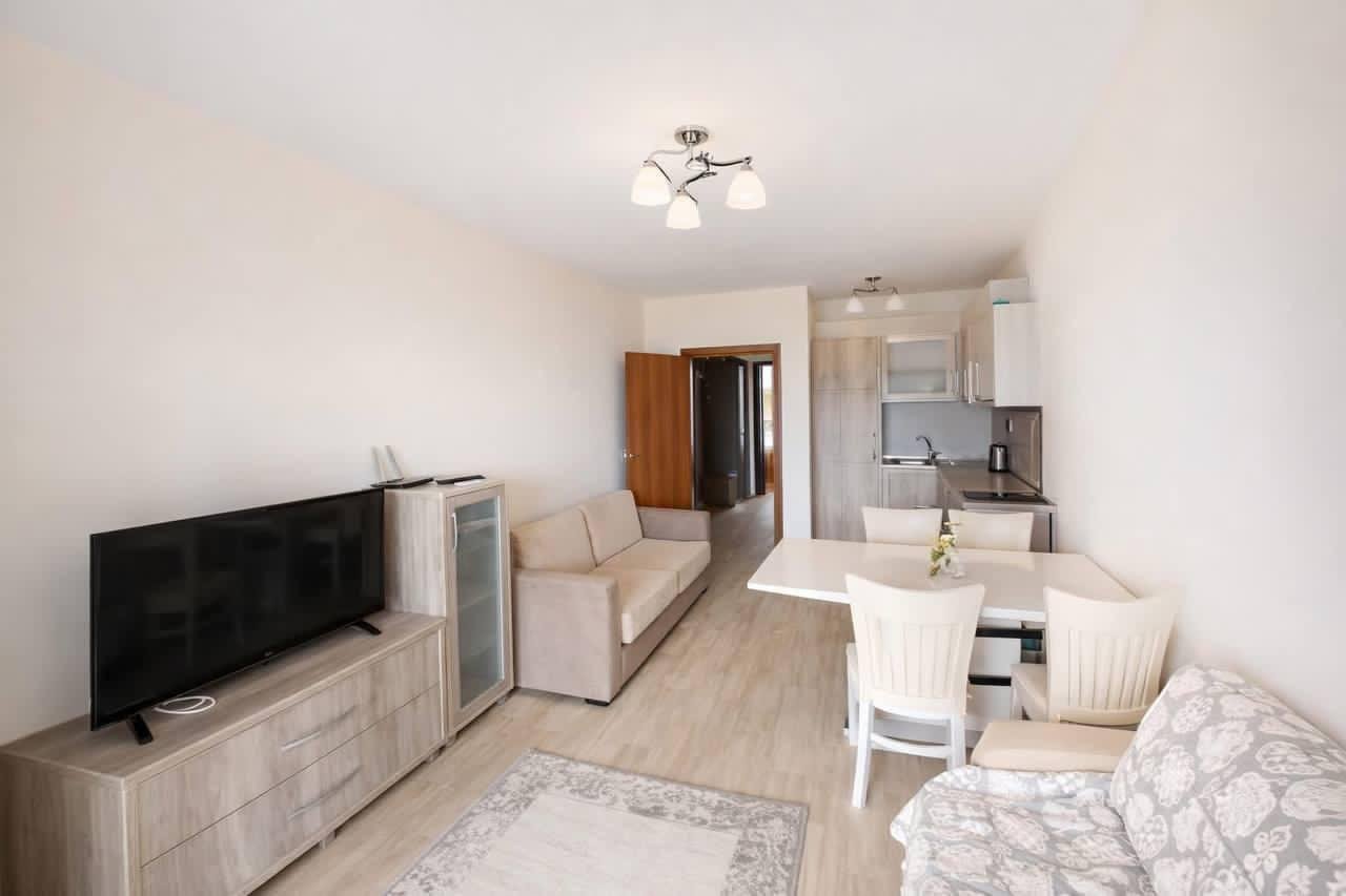 Zweizimmerwohnung in der exklusiven Wohnanlage „Cascadas 15“ in Sonnenstrand, Bulgarien. Die Wohnung hat eine Fläche von 60 m² und befindet sich im 6. Stock. Sie verfügt über ein Wohnzimmer mit Küchenbereich, ein Schlafzimmer, ein Badezimmer sowie einen Balkon. Die Wohnung ist mit luxuriösen Möbeln ausgestattet.