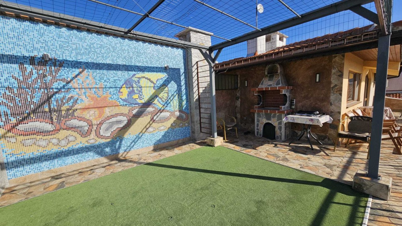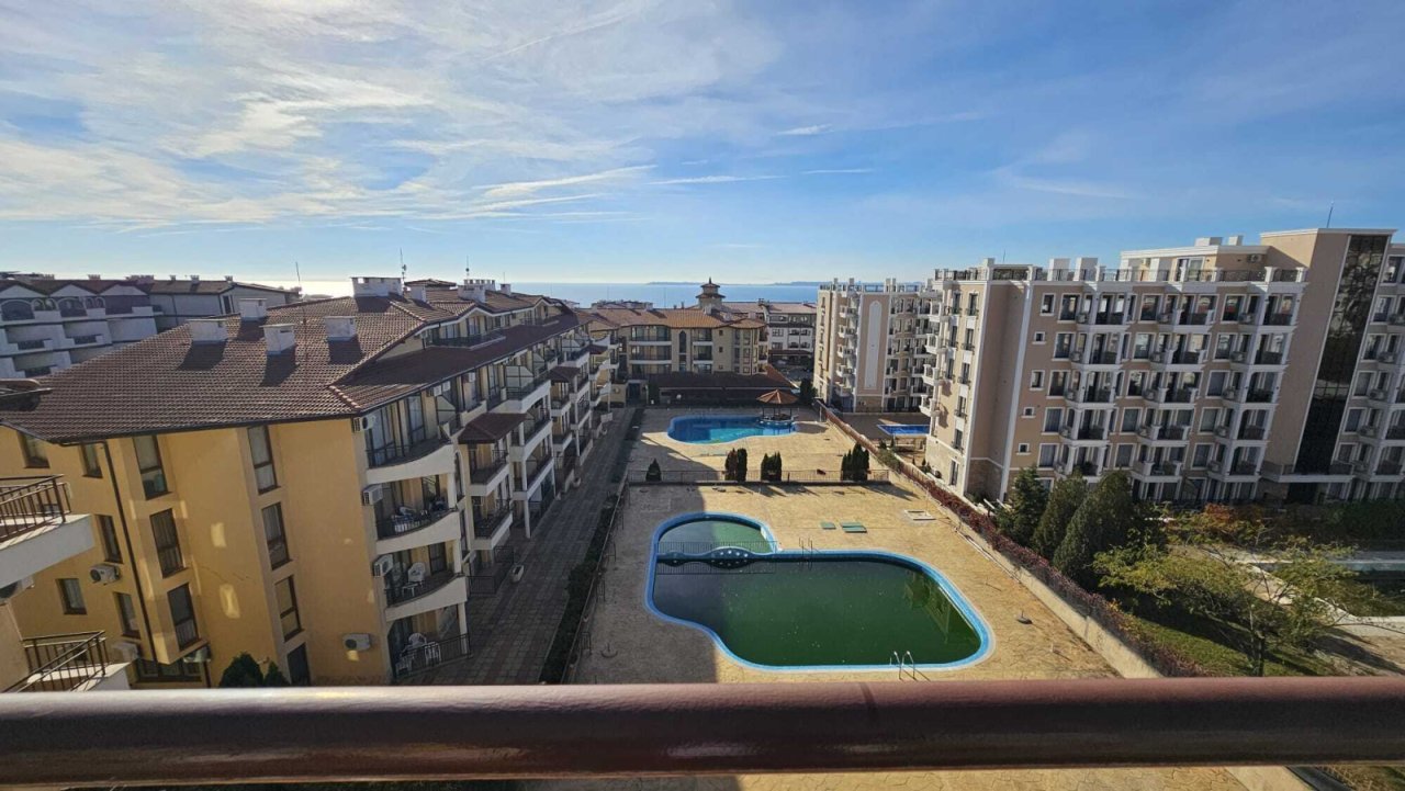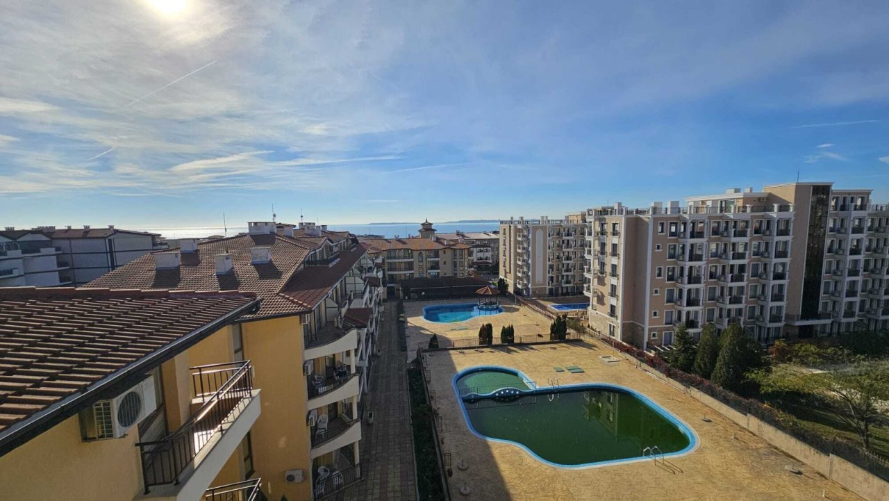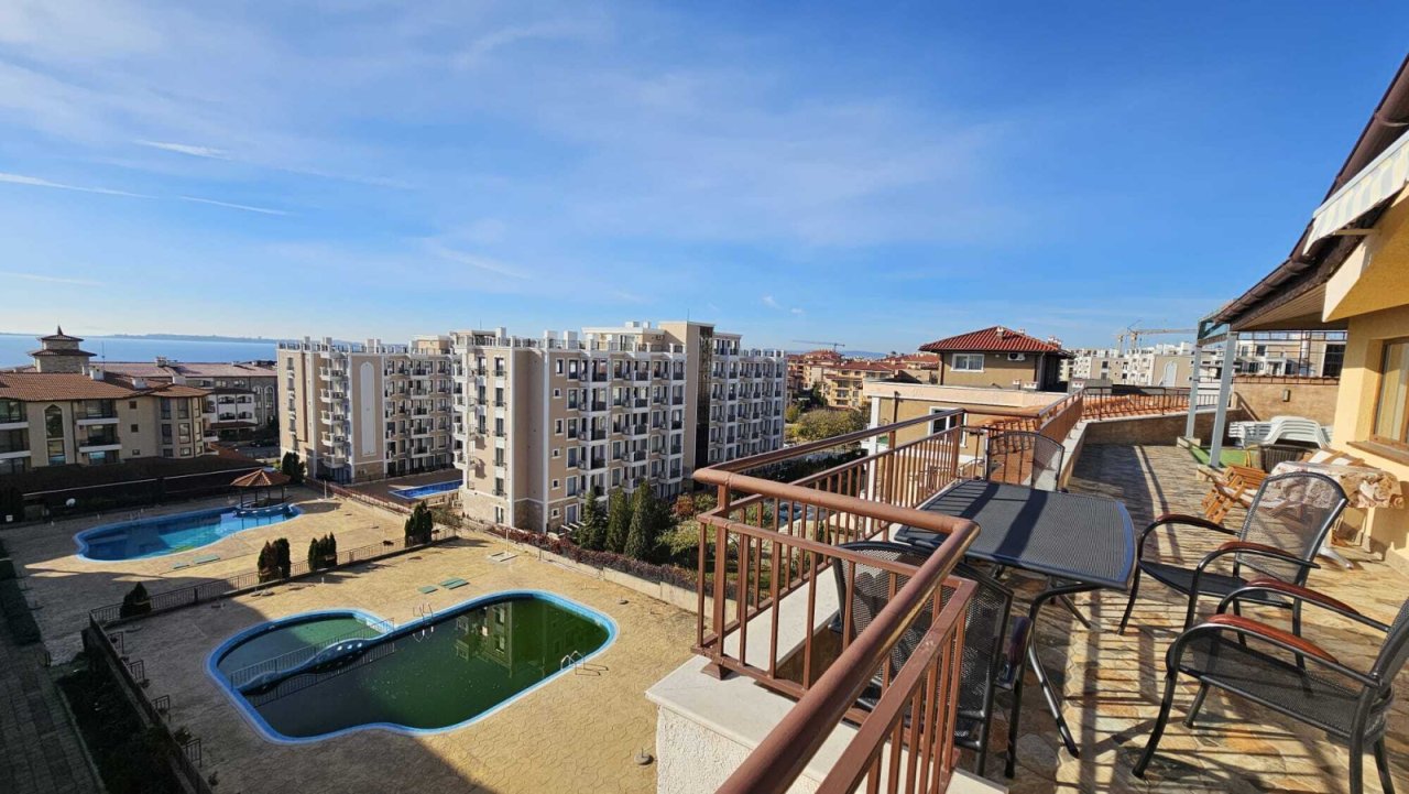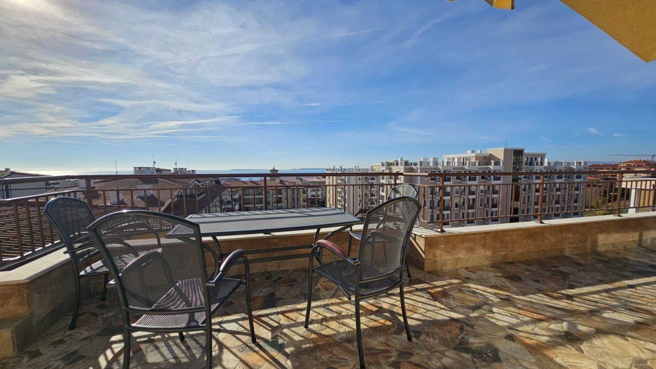 We present to you a 3-room penthouse apartment with sea view in Aqua Dreams, Sveti Vlas, Bulgaria. The apartment is located on the 5th floor of the building, with a total area of 165 m2. The apartment consists of: an entrance hall, a living room with kitchenette and dining area, two spacious bedrooms, two bathrooms with showers, and a large panoramic terrace with stunning sea views, a grill, dining area, and sun loungers under a canopy roof. The apartment is fully furnished and equipped with appliances and ready for a comfortable stay.
