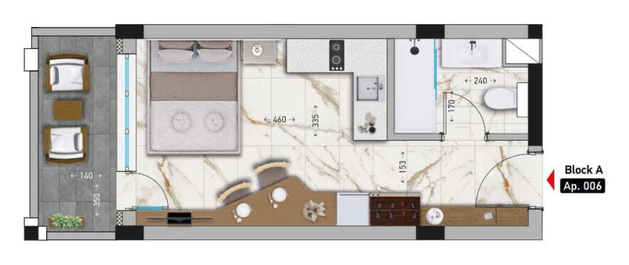 The prices for the studios range from €42,350 to €74,376, depending on the floor.