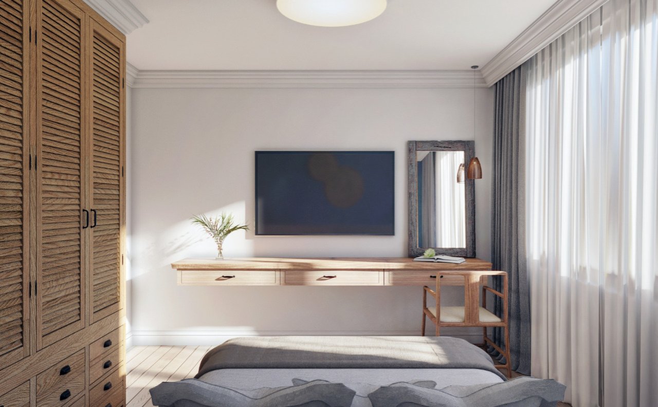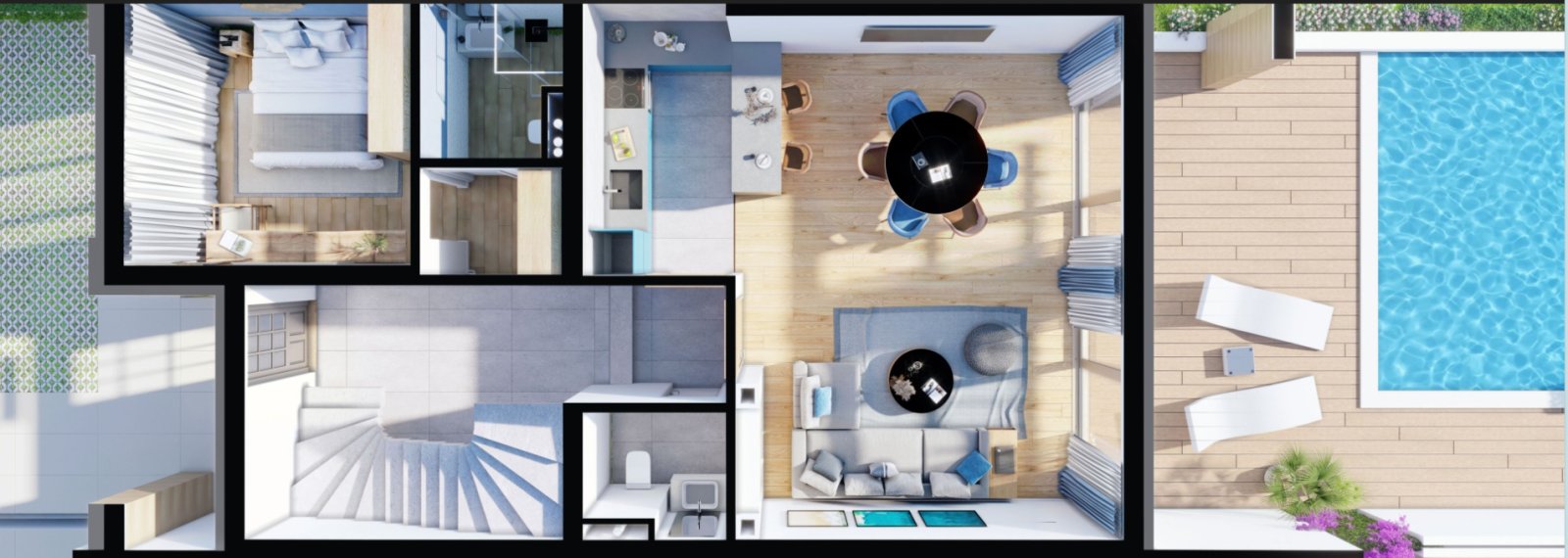 On the second floor, there is a staircase and a corridor leading to two bedrooms, each with its own bathroom and wardrobe, as well as a balcony. One of the bedrooms offers panoramic views of the sea.