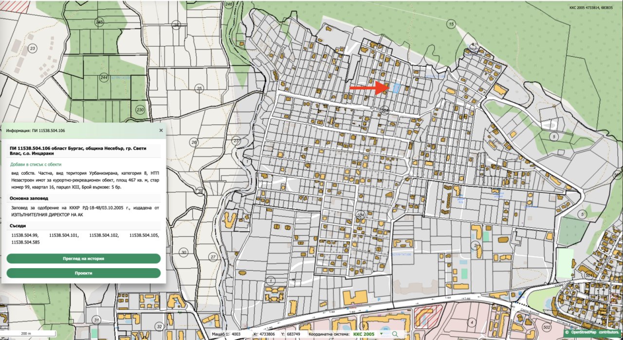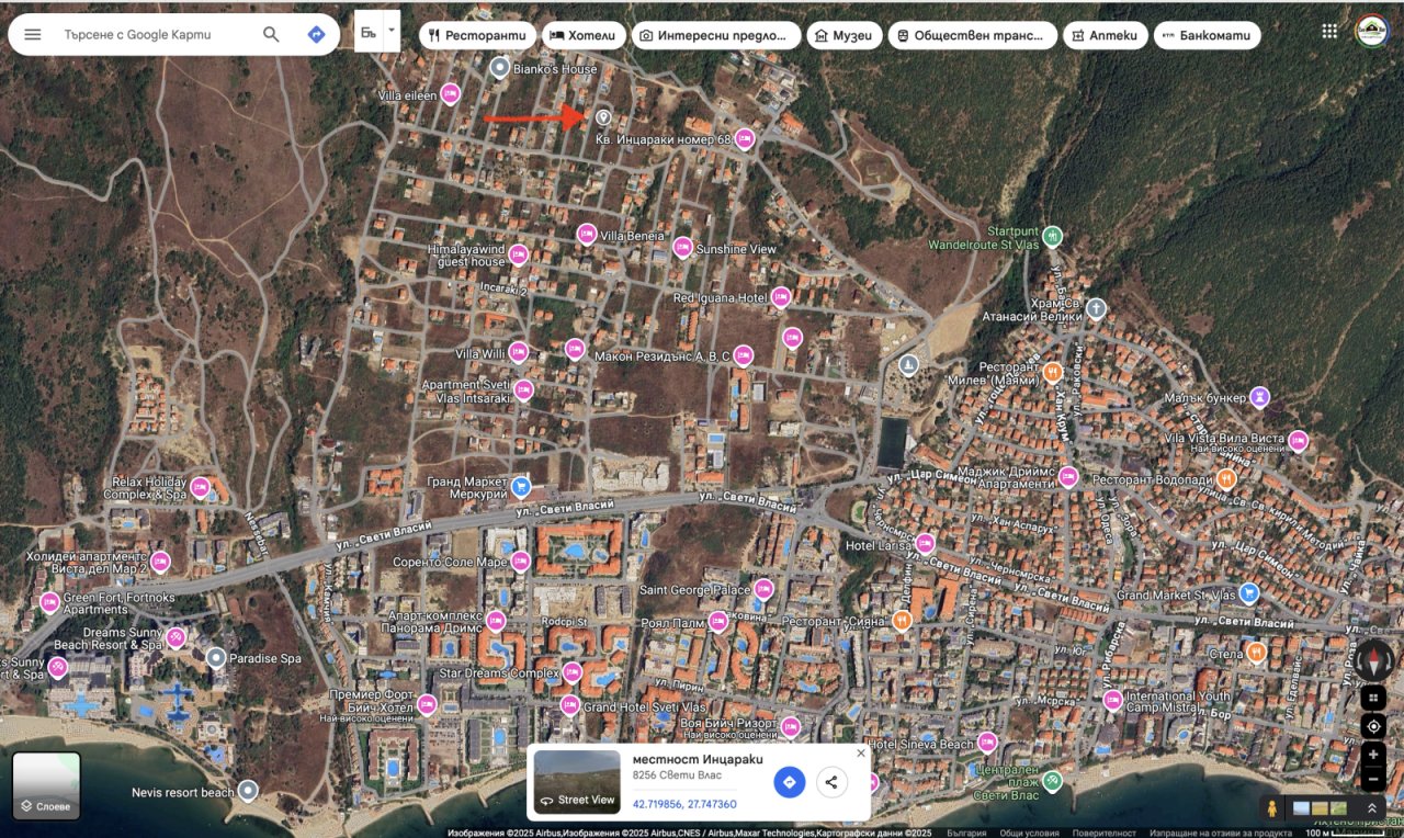 In Intsaraki, one of the most desirable and exclusive areas of Sveti Vlas, there is an excellent building plot for sale measuring 467 m². The property already has water and electricity connections, which significantly simplifies the construction process and saves connection costs. Intsaraki is a popular and upscale residential neighborhood of Sveti Vlas, nestled on a hillside. Almost every plot offers a beautiful panoramic view of the sea, Nessebar, and Sunny Beach.