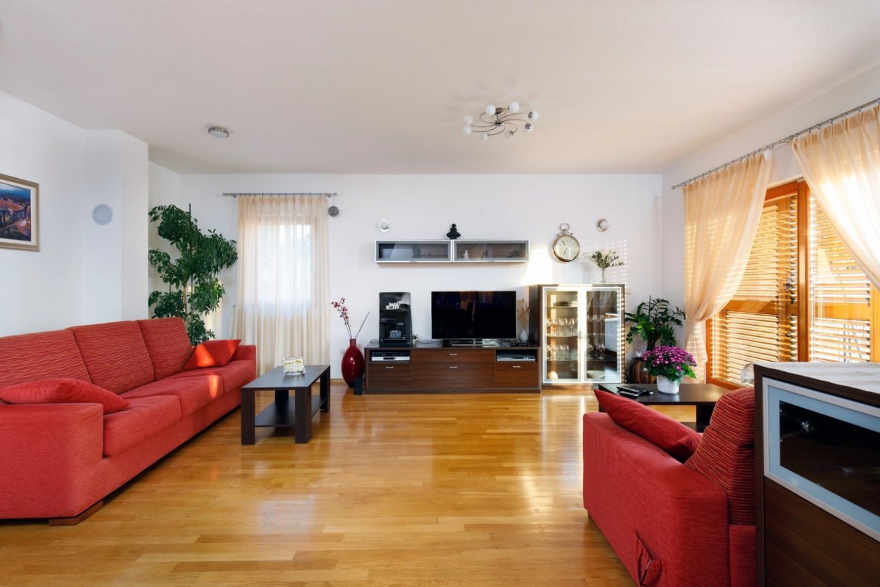 On the ground floor there is a spacious living room connected to a custom-made kitchen and an elegant dining room. From the living area there is direct access to a large terrace with an open view of the sea, which naturally becomes a place for everyday relaxation and evening sitting at sunset. The ground floor also includes a traditional Dalmatian tavern with a covered terrace, ideal for social gatherings and an authentic Mediterranean atmosphere. In the basement there is a relaxation area with billiards and a sauna, which underlines the above-standard character of the entire villa.