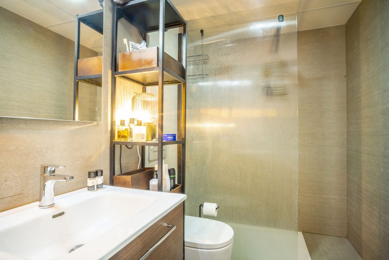 Das Apartment verfügt über zwei elegante Schlafzimmer und zwei moderne Badezimmer und ist somit ideal für Familien, Paare oder als Kapitalanlage zur Kurzzeitvermietung. Das Hauptschlafzimmer bietet viel Platz, Einbauschränke und direkten Zugang zu einer großzügigen Terrasse mit traumhaftem Blick auf das Mittelmeer. Das zweite Schlafzimmer ist ebenfalls hell und gemütlich und eignet sich als Gästezimmer oder Arbeitszimmer.