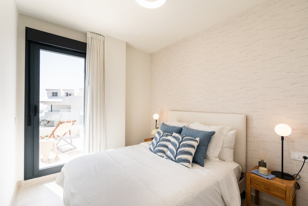 The interior spaces are designed to be functional and stylish. Apartments with 2 or 3 bedrooms and two bathrooms are available. Fine stoneware tiles emphasize elegance and durability, integrated air conditioning ensures comfortable temperatures year-round, and built-in wardrobes provide thoughtful storage space. Private terraces invite you to enjoy Mediterranean light and views daily, making every day special.
