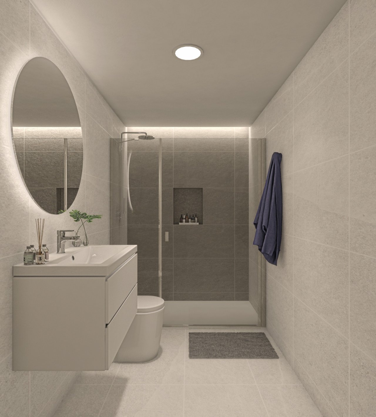 The interiors combine a cozy atmosphere with a modern design, the ceramic floors are elegant and easy to maintain, the layout offers variants with one or two bedrooms and a corresponding number of bathrooms, built-in wardrobes save space and maintain order. Each bungalow has a terrace and solarium for maximum use of the outdoor space and security is increased by a video intercom.