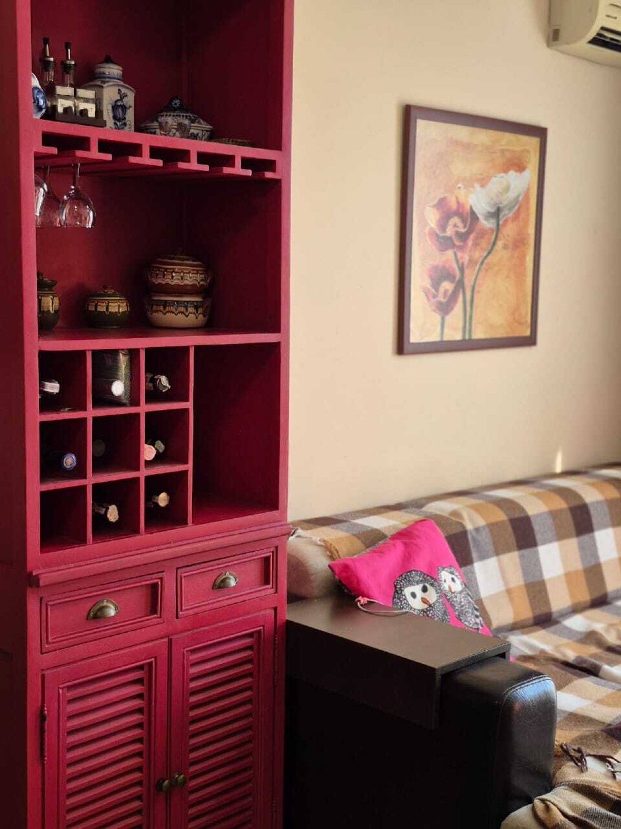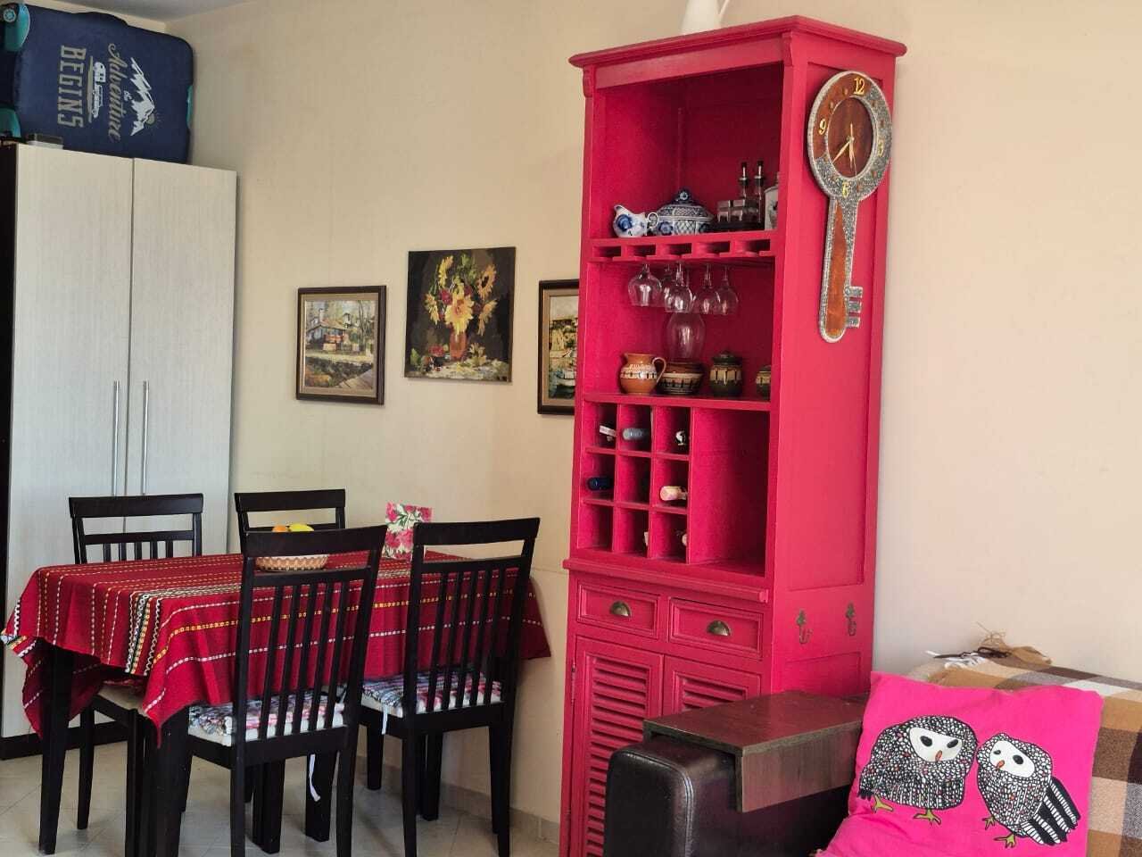 La zona giorno è dotata di un comodo divano, tavolino da caffè, parete attrezzata e TV. L’angolo cottura integrato è funzionale e offre tutti gli elementi necessari per l’uso quotidiano.