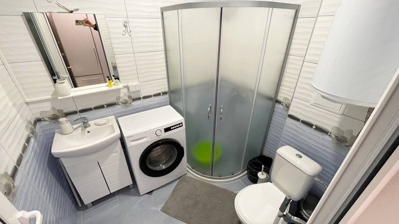 Bagno con box doccia, dotato di lavatrice