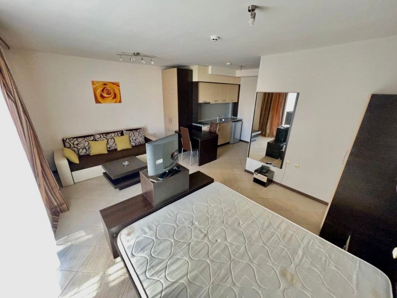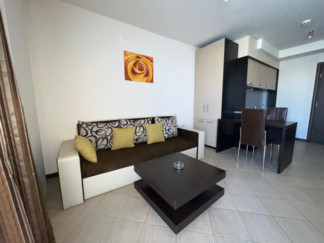 Offriamo un accogliente monolocale nel complesso Tarsis 1, nella rinomata località turistica di Sunny Beach, in Bulgaria. L'appartamento è composto da un soggiorno con area notte, zona pranzo e cucina integrata, un bagno e un balcone.