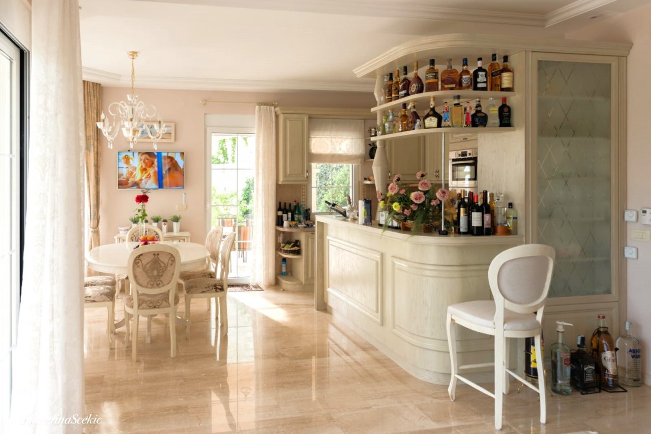 Na parterze znajdują się oddzielne mini-apartamenty z kuchnią, jadalnią, sypialnią i łazienką, idealne dla gości lub na wynajem krótkoterminowy. Dom posiada otwartą werandę z zielenią i widokiem na morze, garaż na dwa samochody, zaplecze techniczne, strefę wellness z sauną i strefą relaksu, prysznicem i toaletą oraz piwniczkę na wino.