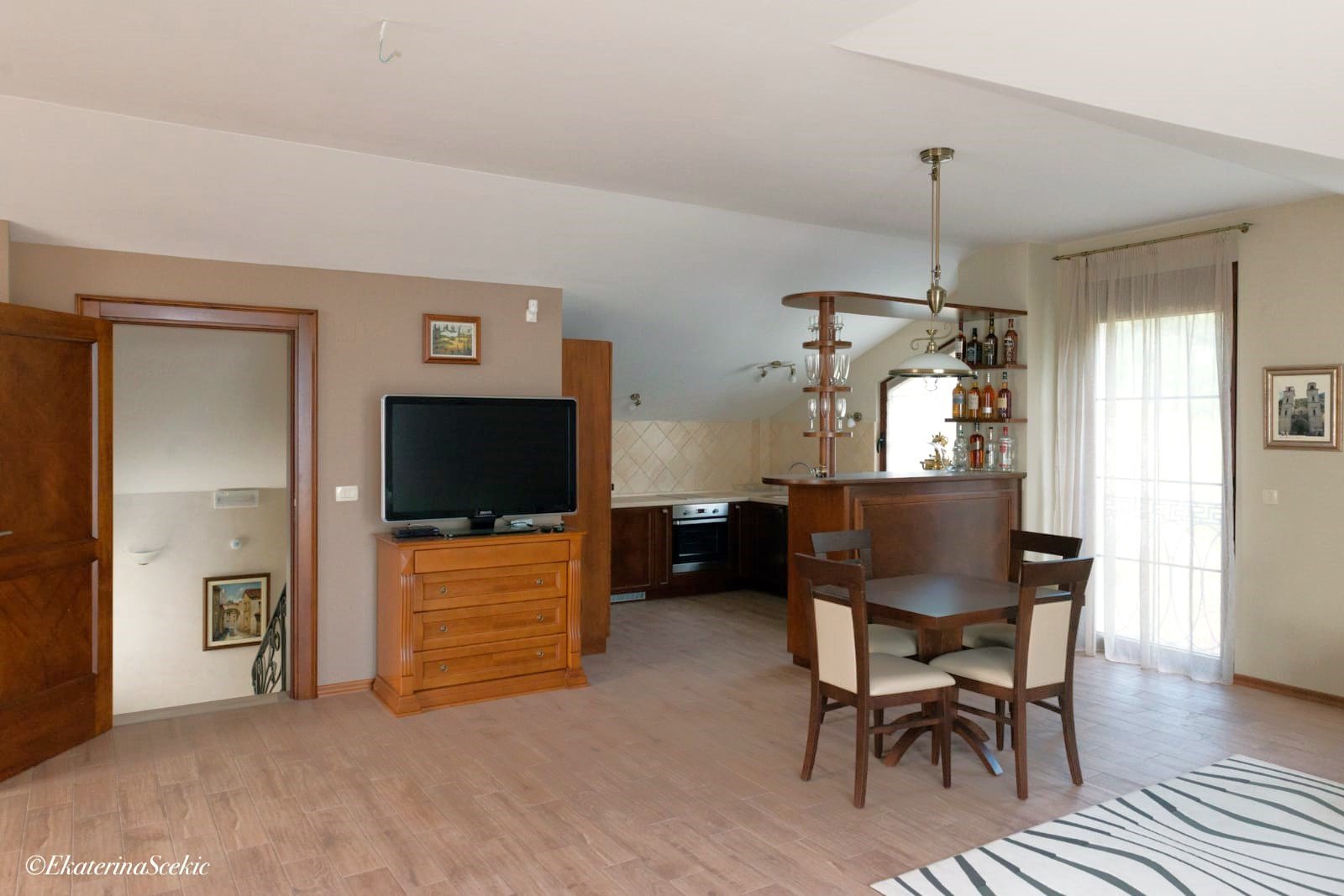 Na trzecim piętrze znajduje się przestronny apartament typu studio z kuchnią, barem, jadalnią i salonem, idealny na prywatny apartament lub luksusową sypialnię główną.