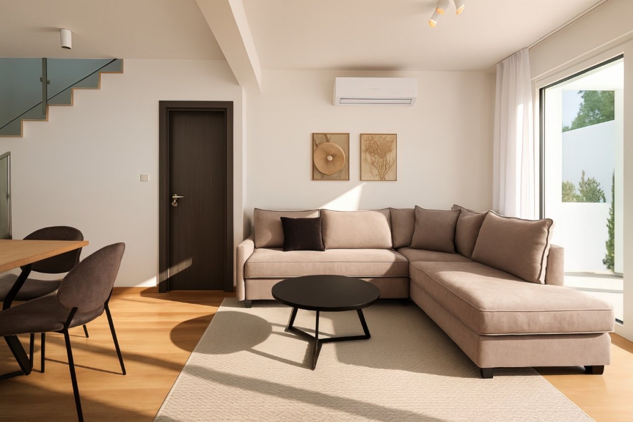 Dom został zaprojektowany w nowoczesnym stylu śródziemnomorskim, z naciskiem na prostą elegancję, funkcjonalność i mnóstwo naturalnego światła. Na parterze znajduje się oddzielny salon połączony z kuchnią i jadalnią, z bezpośrednim dostępem do tarasu i prywatnego ogrodu. Na piętrze znajdują się trzy sypialnie i łazienka, co tworzy idealne środowisko do życia rodzinnego i rekreacji.