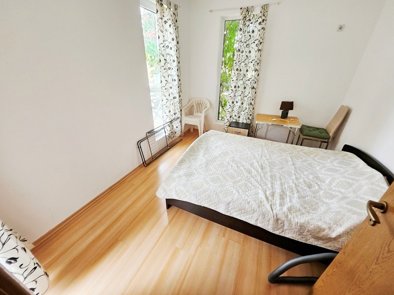 Ванная комната компактна и оборудована душем, унитазом и раковиной. В целом, недвижимость находится в пригодном для проживания состоянии и может быть использована или сдана в аренду без крупных вложений.