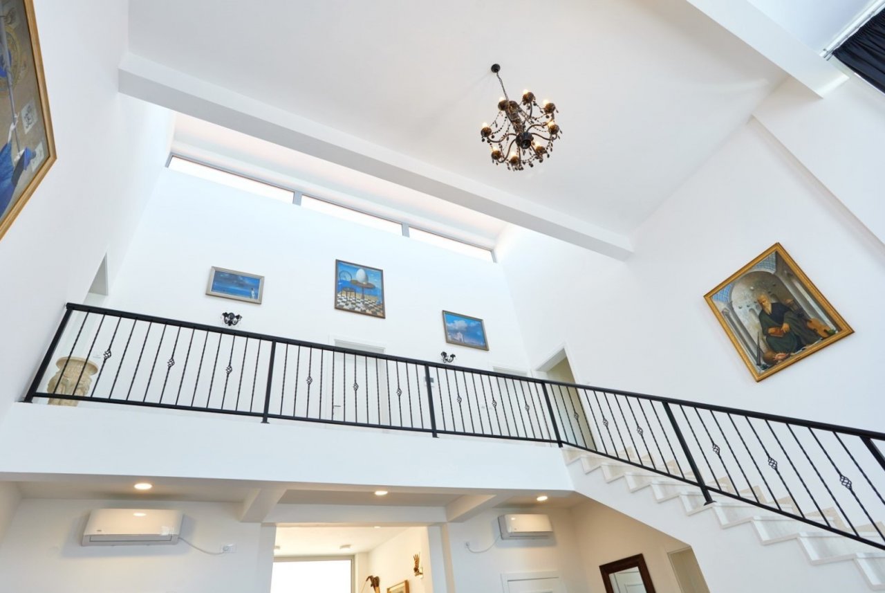 Вилла общей площадью 338 м² расположена на двух этажах и предлагает полноценную семейную жизнь с большим пространством для гостей и длительного проживания. На первом этаже находится открытое жилое пространство, объединяющее гостиную, столовую и кухню, а также кабинет или гостевая спальня, две ванные комнаты, подсобное помещение и крытая терраса. Весь первый этаж оборудован системой подогрева пола, а благодаря высоким потолкам до восьми метров и большим французским окнам интерьер кажется исключительно просторным, свежим и наполненным дневным светом. Вид на море здесь — неотъемлемая часть повседневной жизни.