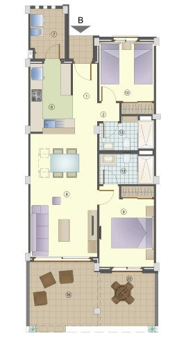Трехкомнатная квартира площадью 95 м² имеет выход в частный сад площадью 78 м², который естественным образом расширяет жилую зону. Благодаря большим окнам интерьер кажется свежим, просторным и наполненным естественным светом. Гостиная соединена с кухней и образует уютный центр квартиры, а две спальни обеспечивают достаточную приватность для семьи и гостей. Архитектура проекта сочетает в себе современные линии с традиционным майорканским стилем и акцентом на связь интерьера с экстерьером.…